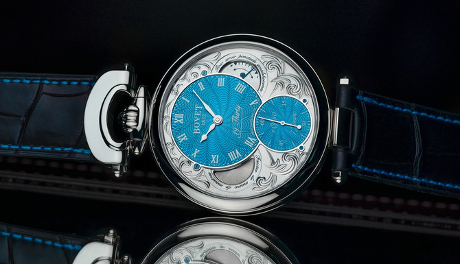 Швейцарский часовой бренд Bovet представляет наручные часы 19Thirty Fleurier NTS0058 в корпусе из полированной нержавеющей стали, размером 42 мм, где установлен механический калибр с ручным заводом 15BM04 с запасом хода на 7 дней работы. Сквозь защитное сапфировое стекло показываются часы, минуты, секунды, уровень запаса хода. Циферблат гильоширован вручную. Ремень из кожи аллигатора оснащен вставкой из стали классического типа. Водонепроницаемость корпуса рассчитана на 30 метров. Часы выпущены в 2021 году лимитированным тиражом в 60 экземпляров.