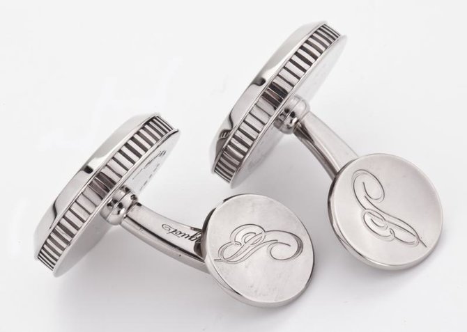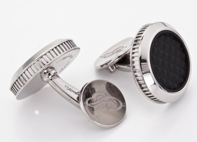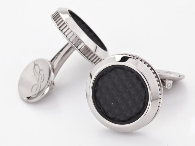 Запонки из 18-каратного белого золота с рифленым ободком, центральная вставка из черного каучука с узором "парижские гвозди" (Clou de Paris). Предлагаются также в версии из желтого золота, 9901.BA.CP, и в версии из розового золота, 9901.BR.CP