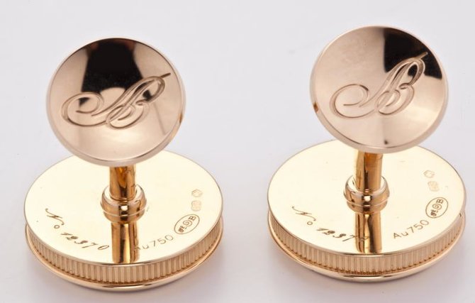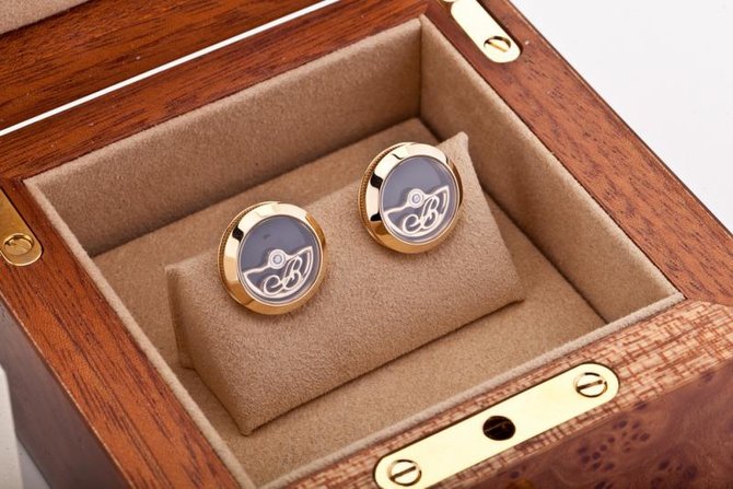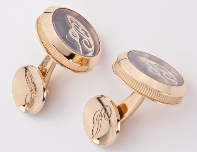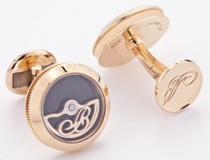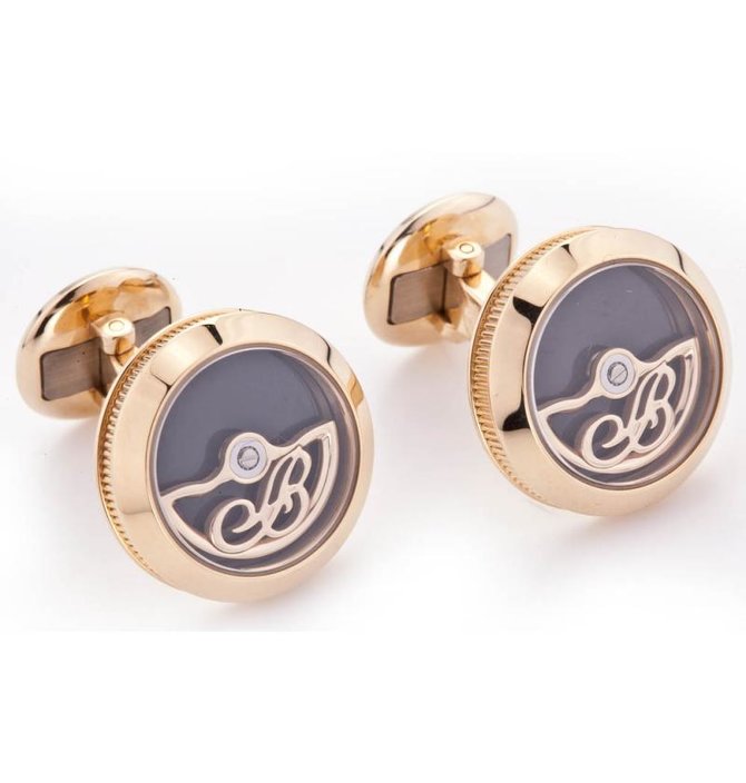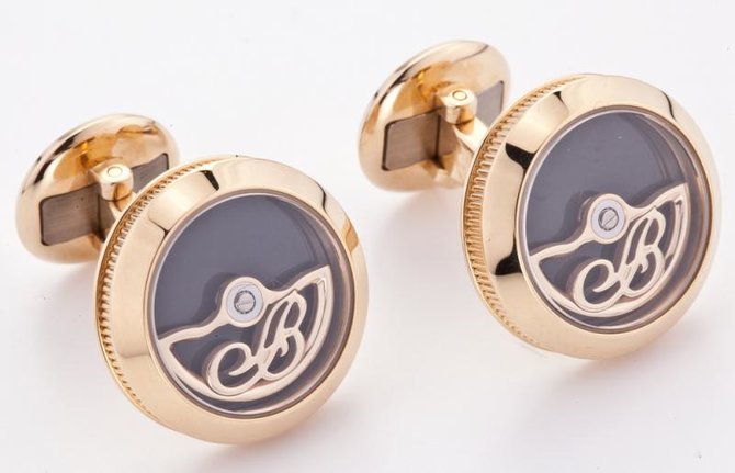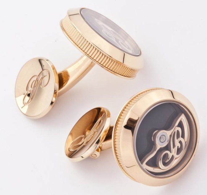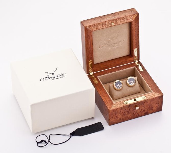Запонки Breguet изготовлены из желтого золота 18К с эмалевым лаком. Размер 17 х 4 мм. Особую эксклюзивность запонкам придает вращающийся ротор, как у часов с автоподзаводом.