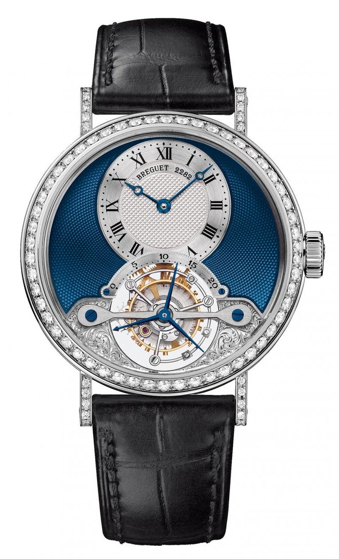 Яркость и необычный дизайн сочетается в модели 3358BB/2Y/986-DD0D от производителя Breguet. Круглый полированный корпус сделан из белого золота 18 карат. Неглубокое рифление украшает боковую часть корпуса. В положении 12 часов смещен циферблат с часовой и минутной стрелками. На циферблате выгравированы вручную арабские цифры. Безель а также крепления ремешка украшены бриллиантами. В положении 6 часов находится каретка турбийона. Благодаря задней прозрачной крышке, которая сделана из сапфира, можно наблюдать за работой ультратонкого механизма. Запас хода равен примерно 50 часам. Водонепроницаемость данной модели составляет 100 футов, что равняется 30 метрам. Ремешок сделан из кожи аллигатора, и оснащен раскладной золотой застежкой 18 карат. Застежка украшена 25 бриллиантами.
