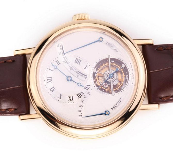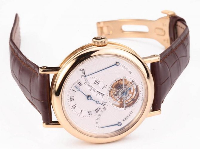 Классические наручные часы из серии «Grande Complication» в корпусе из 18-каратного желтого золота, с турбийоном. Механизм с ручным подзаводом, гравированный вручную. 24 часовой циферблат и отображение запаса хода. Маленькая секундная стрелка на валу турбийона. Посеребренный золотой циферблат, гравированный вручную узором в виде сетки. Тыльная сторона корпуса из сапфирового стекла. Водонепроницаемые.