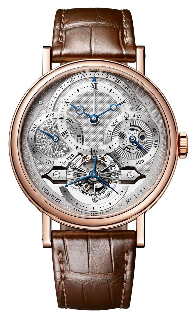 Корпус из 18-каратного розового золота с тонким рифлением на боковых поверхностях. Задняя крышка корпуса выполнена из сапфирового стекла. Диаметр 41 мм. Приваренные ушки со стержнями, закрепленными винтами. Водонепроницаемость до 3 бар (30 метров). Циферблат из 18-каратного золота, посеребренного с четырьмя разными гильошированными узорами. Проставлены индивидуальный номер и подпись «Breguet». Отдельный циферблат с индикацией римскими цифрами на сапфировом диске. Стрелки «Breguet» из вороненой стали с открытым наконечником. Ретроградная индикация даты в положении «на 12 часов», индикация дней в положении «на 9 часов», индикация месяцев и високосных лет в положении «на 3 часа». Вспомогательный циферблат с малой секундной стрелкой расположен на оси турбийона. Механизм с ручным подзаводом с турбийоном и вечным календарем. Пронумерован, имеет надпись «Breguet». Калибр 558QP2. 14 ½ линий, 21 камень. Запас хода 50 часов. Боковой анкерный спуск и балансир с регулировочными винтами на пружине «Breguet». Частота колебаний 2.5 Гц. Механизм отрегулирован в 6 положениях. Кожаный ремешок со складной тройной застежкой.