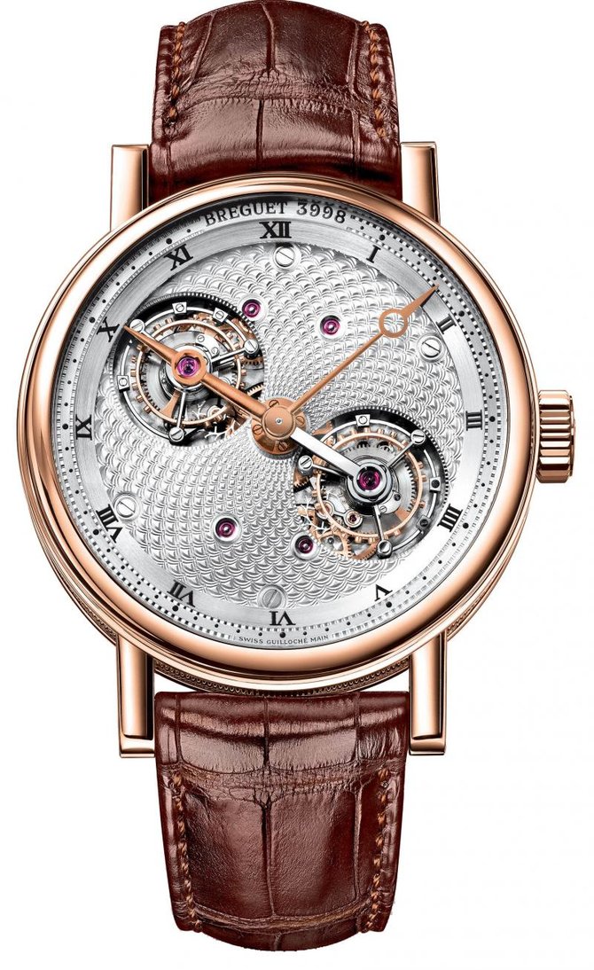 Если Вы ищете классику, многофункциональность, и точность - советуем Вам обратить внимание на мужские наручные часы Classique Grande Complications Double Tourbillon 5347BR/11/9ZU от производителя Breguet. Круглый полированный корпус сделан из розового золота в 18 карат, и имеет такие параметры: 44 мм в диаметре, и 17.05 мм в ширине. Одной из главной особенностью данной модели является турбийон. Циферблат посеребрен и сделан из цельной золотой пластины в 18 карат. Очень красиво смотрится орнамент гильоше на посеребренном циферблате. Узор нанесен вручную при помощи гильоширной машинки. Стрелки отлиты вручную из вороненной стали, и украшены "яблоками" на окончаниях, что характерно для стиля Breguet. Ультратонкий механизм оснащен калибром 588 и имеет запас хода 50 часов. Водонепроницаемость модели составляет 30 метров или же 100 футов.Ремешок сделан из кожи крокодила, и оснащен вставкой из золота в 18 карат.