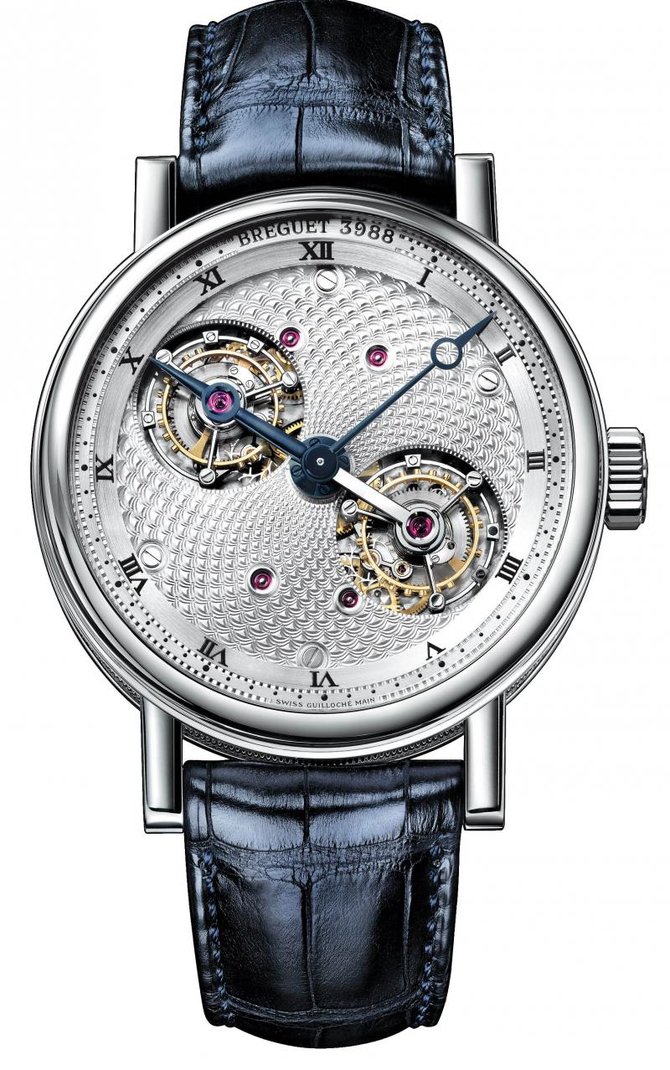 Breguet представляет новые классические мужские наручные часы из серии «Grande Complication» 5347PT/11/9ZU в корпусе из платины 950 пробы. Циферблат сделан из цельной золотой пластины в 18 карат. Римские цифры на циферблате нанесены вручную. Посеребренный циферблат украшает великолепный орнамент гильоше, который был сделан вручную при помощи гильоширной машинки. Одно из главных достоинств модели это турбийон. На мосту который соединяет два турбийона расположена часовая стрелка. Крышка корпуса сделана из сапфира. Ультратонкий механизм обладает калибром 588, и имеет запас хода на 50 часов. На задней стороне находится выгравированный рисунок, который представляет из себя Солнечную систему, которую символизируют обороты турбийонов и их совместное вращение вокруг оси за 12 часовой период. Водонепроницаемость модели составляет 100 футов, что равняется 30 метрам. Ремешок сделан из кожи аллигатора и оснащен золотой застежкой в 18 карат.