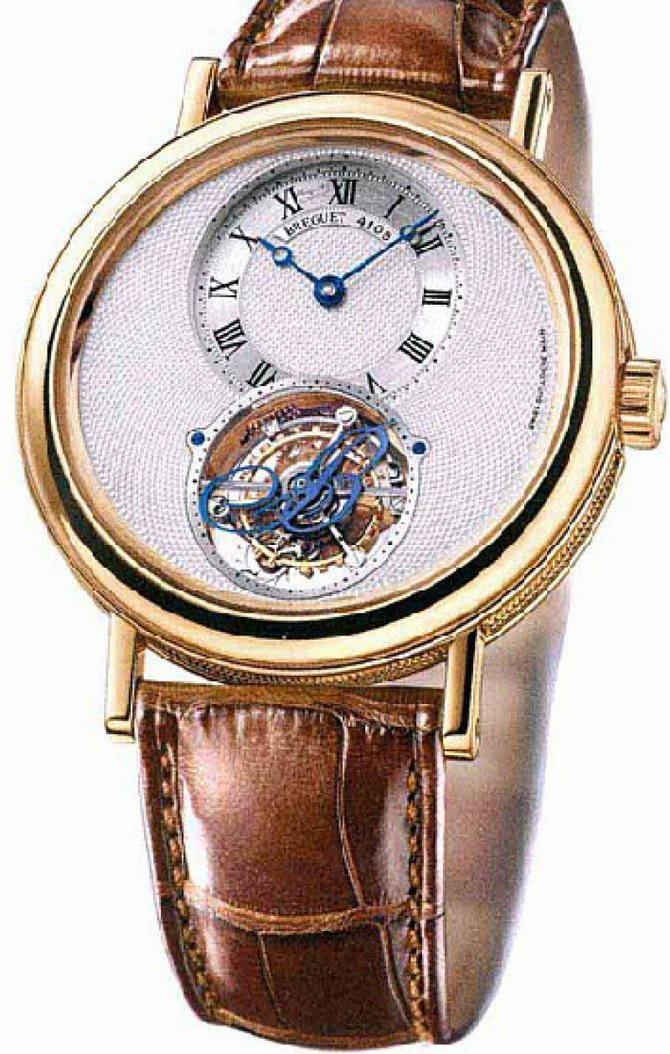 Наручные мужские часы Classique Complications 5357BA/12/9V6 от производителя Breguet, могут показаться простыми на первый взгляд, но на самом деле это изделие точное и многофункциональное. Круглый корпус выполнен из желтого золото в 18 карат. На боковой стороне корпуса имеется неглубокое рифление, что полне характерно для стиля Breguet. Стрелки отлиты вручную из вороненной стали. Окончания стрелок украшены стильными "яблоками" Breguet. Циферблат сделан из цельной пластины в 18 карат. На посеребренном циферблате располагается орнамент гильоше, сделанный вручную при помощи гильоширной машинки. Одна из главных особенностей изделия это турбийон. Водонепроницаемость модели составляет 100 футов, что равняется 30 метрам. Благодаря задней прозрачной крышке сделанной из сапфира, можно наблюдать за работой точного механизма. Запас хода приблизительно равен 50 часов. Ремешок сделан из кожи аллигатора, и оснащен золотой застежкой в 18 карат.