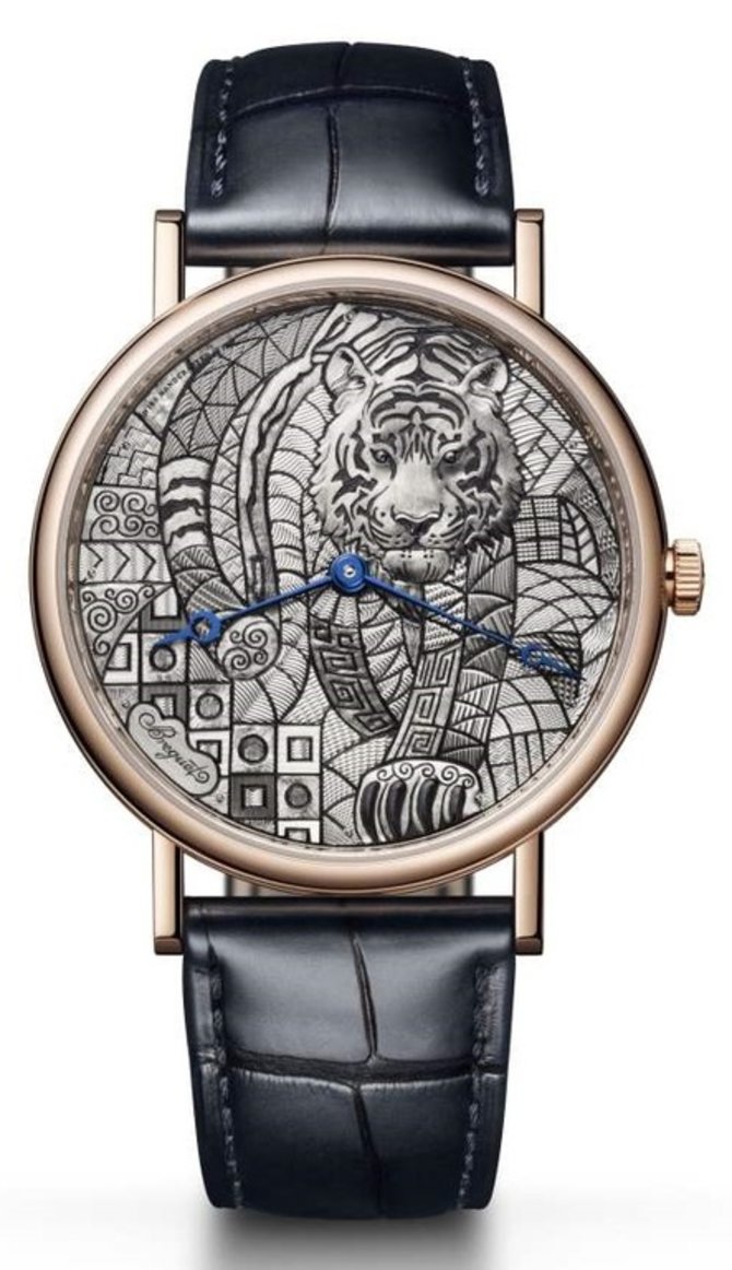Знаменитая швейцарская часовая компания Breguet представила модель наручных часов Classique 7145 7145BR/15/9WU 03 на базе мануфактурного автоматического калибра Calibre 502.3 с запасом хода на 45 часов работы и возможностью индикации данных текущего времени на художественном гильошированном циферблате с образом тигра. Циферблат защищен стеклом из сапфирового кристалла, который сверху покрыт противобликовым покрытием. Корпус из розового 18-каратного золота отличается 30-метровой влагостойкостью. В комплекте с часами поставляется ремень из кожи аллигатора и фирменная золотая пряжка. Данная модель выпущена в 2022 году.