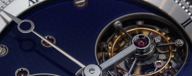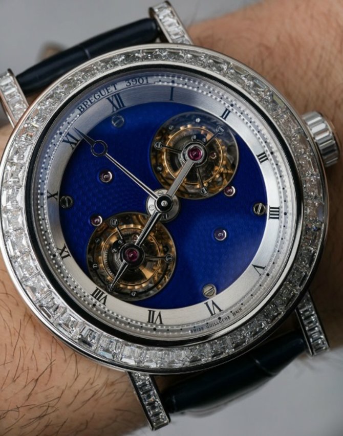 Швейцарские мужские часы линии Grande Complication от мануфактуры Breguet представлены в платиновом корпусе. Фасет, кайма и ушки корпуса украшают 107 белых бриллиантов багетной огранки, что составляет 30,30 карат. Задняя крышка корпуса выполнена из сапфирового стекла. Водонепроницаемость 30 м. Модель оснащена механизмом 588 с ручным подзаводом. Запас хода до 50 часов. На синем гильошированном циферблате центральные стрелки указывают часы, минуты и секунды. Циферблат надежно защищен от царапин сапфировым стеклом. Однако главная особенность этого аксессуара - это два вращающихся турбийона, которые совершают полный оборот за 12 часов. Они прикреплены мостом к центральной пластине. Турбийон - это конструкция, которая нейтрализует влияние земной гравитации на механизм часов. Модель поставляется на черном ремешке из кожи аллигатора с раскладывающейся застежкой из платины 950.