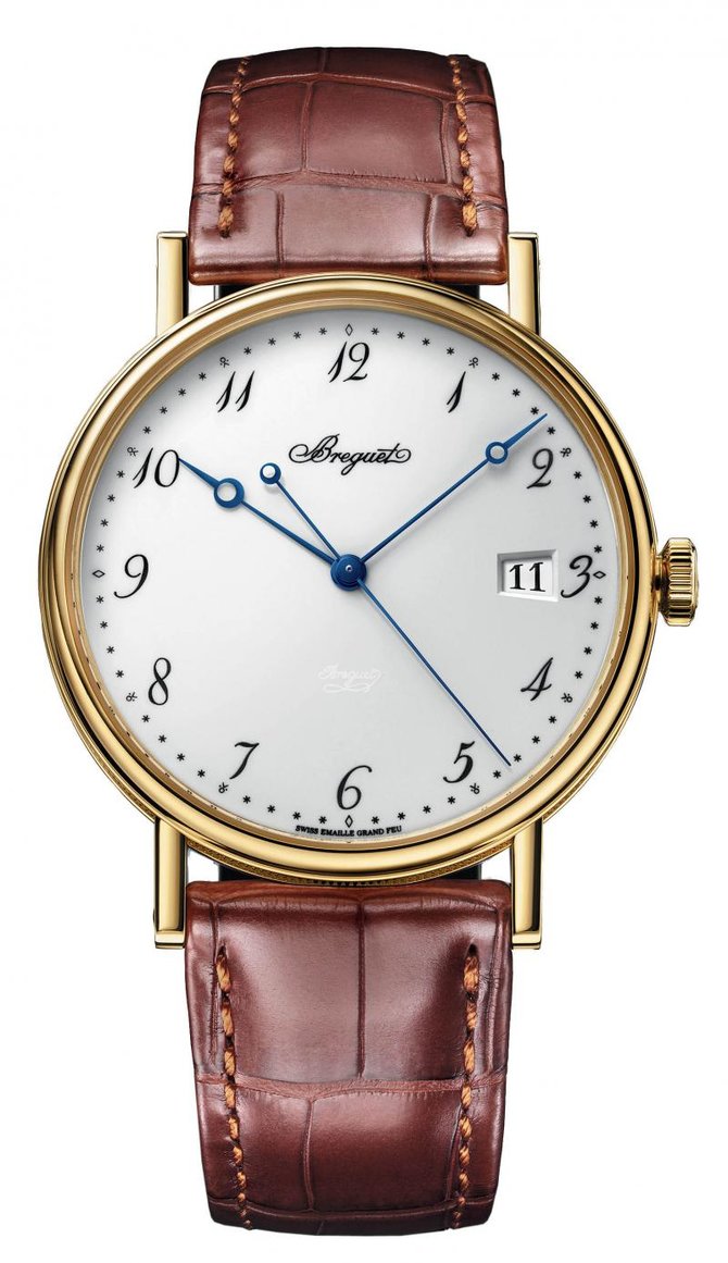 Мужские наручные часы данной модели выполнены из желтого золота 18 карат 750 пробы. Механизм - автоматический. Анкер и спусковое колесо из кремния а значит не требуют смазки.. Стекло сделано из сапфира. Циферблат отделан белой эмалью по технике "горячая эмаль" Арабские цифры нанесены вручную в стиле Breguet что придает долю элегантности данной модели часов. Окошко даты располагается в позиции три часа. Ремешок сделан из кожи аллигатора с золотой вставкой. Благодаря прочной прозрачной задней крышке сделанной из сапфира можно наблюдать за работой механизма часов. Водонепроницаемость данной модели составляет 100 футов а это равняется 30 метрам. Автоматический механизм оснащенный 35-ью драгоценными камнями обеспечивает запас хода на 55 часов.