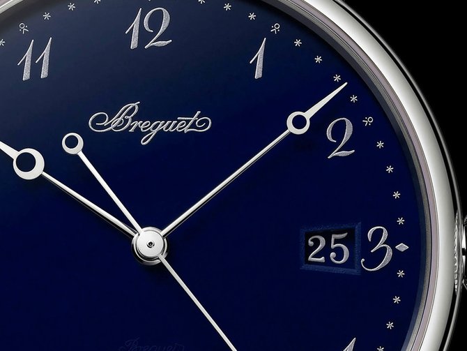 Классические швейцарские часы представлены в круглом корпусе из белого золота компанией Breguet - модель Classique 5177 (Ref. 5177BB/2Y/9V6). На синем циферблате указываются часы, минуты, секунды и дата. Стрелки из белого золота выполнены в традиционном стиле Breguet. Запас хода установленного калибра 777Q с автоподзаводом производства марки Breguet составляет 55 часов. Ремень из кожи аллигатора синего цвета оснащен классической пряжкой из белого золота. Водонепроницаемость корпуса рассчитана на погружение до 30 метров глубины. Часы выпущены в 2019 году. Для защиты циферблата на лицевую часть корпуса установлено сапфировое стекло. Сквозь заднюю крышку из сапфирового кристалла виден ротор автоподзавода.