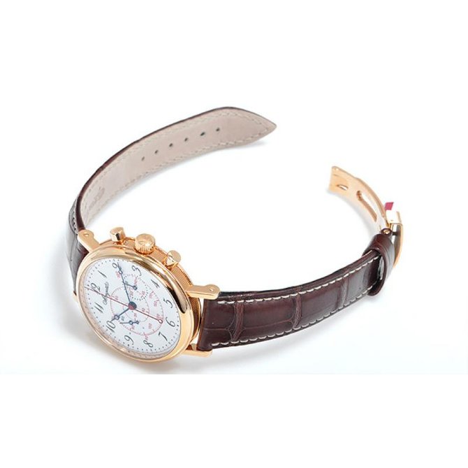 Мужской наручный хронограф Classique Chronograph 5247BR/29/9V6 от производителя Breguet привлекает высокой надежностью механизма, и хорошей наглядностью циферблата. Круглый корпус модели отполирован и сделан из 18-ти каратного золота. Диаметр корпуса 39мм, а толщина 12.1 мм. На боковой поверхности расположен декорированный узор из легкого рифления, что является в стиле Breguet. Циферблат изготовлен по технике "горячая эмаль". На нем четко видны черные арабские цифры и минутные маркеры. Стрелки выполнены также в стиле Breguet: из вороненной стали, и с окончаниями - яблоками. В центре расположена тахиметрическая красная шкала в виде спирали. Тридцати минутный дополнительный счетчик установлен на позиции 3 часа, а секундный циферблат на позиции 9-ти часов. Кнопка на позиции 2 часа включает/выключает хронограф, а обнуляет его показания другая расположенная на позиции 4-ех часов. Механический калибр данной модели 533.3 оснащен 23-мя рубиновыми камнями что дает запас резервного хода на 48 часов. Задняя крышка прозрачная так как выполнена из сапфира, а благодаря этому можно насладится таким зрелищем как работа механизма. ремешок сделан из кожи аллигатора и имеет золотую застежку в 18 карат.