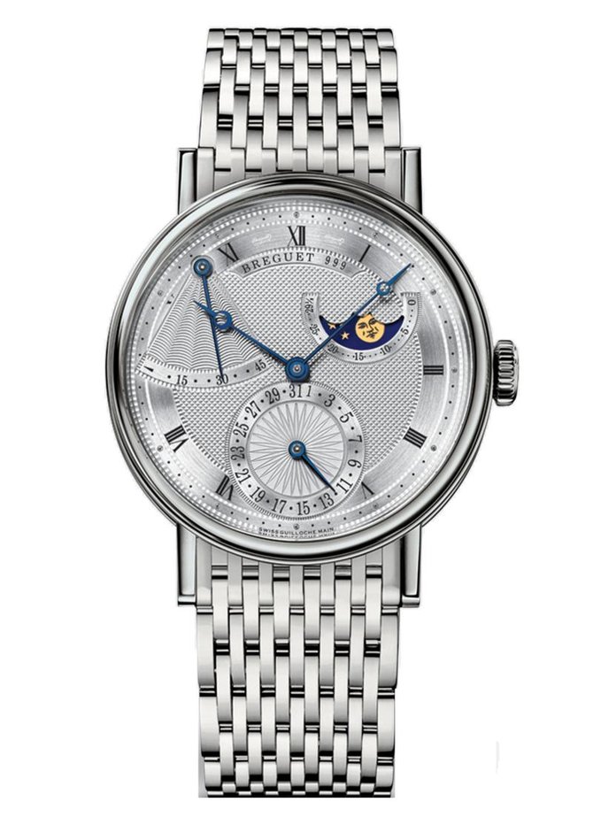 Часы линии Classique из 18-каратного белого золота. Ультратонкий автоматический механизм с указателями даты, запаса хода, фаз Луны и лунного цикла. Спираль и анкер из кремния. Циферблат из посеребренного золота с гильошированным вручную узором. Задняя крышка из сапфирового стекла. Водонепроницаемые до 3 бар (30 м). Диаметр: 39 мм. Мануфактура неоднократно реализовывала смелые проекты, одним из которых было воссоздание легендарных часов Марии-Антуанетты, считавшихся бесследно пропавшими. Задание отличалось чрезвычайной трудностью, поскольку в распоряжении мастеров и инженеров Breguet были лишь немногочисленные сохранившиеся архивы и технические описания. Повышенная частота привела и к увеличению точности и стабильности хода часов, улучшив рабочие характеристики баланса. Безусловно, результаты работы над повышением балансовой частоты часов могут быть применены не только в хронографах. Разработка решений, направленных на преодоление негативного воздействия внешних магнитных полей в окружающей среде, открыла команде из отдела разработок Breguet совершенно новые перспективы. Более того, часовщики Мануфактуры не только смогли ликвидировать недостатки классических регуляторов, действие которых основано на трении, но и сконструировали инновационную систему с магнитами, в которой используются вихревые токи (токи Фуко). Таким образом, магнитный регулятор решает проблемы износа деталей, посторонних шумов и потребности в большом количестве энергии.