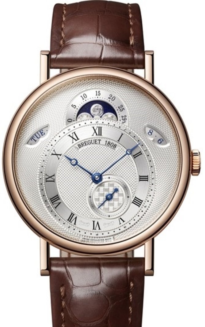 Данные швейцарские часы 7337 7337BR/15/9VU от мануфактуры Breguet вошли в коллекцию "Classique". Корпус сделан из розового золота, размером 39 x 9.9 мм. Функции, отображающиеся на гильошированном циферблате сквозь сапфировое стекло: часы, минуты, секунды, дата, день недели, фаза луны. Обеспечивает выполнение функций автоматический швейцарский мануфактурный механизм 502.3 QSE1, разработанный и собранный на мануфактуре Breguet. Запас хода механизма - 45 часов. Коричневый ремень из кожи аллигатора дополнен золотой застежкой. Герметичность корпуса - 30 метров (3 бар). Модель Classique 7337 7337BR/15/9VU швейцарский бренд Breguet представил в 2020 году.