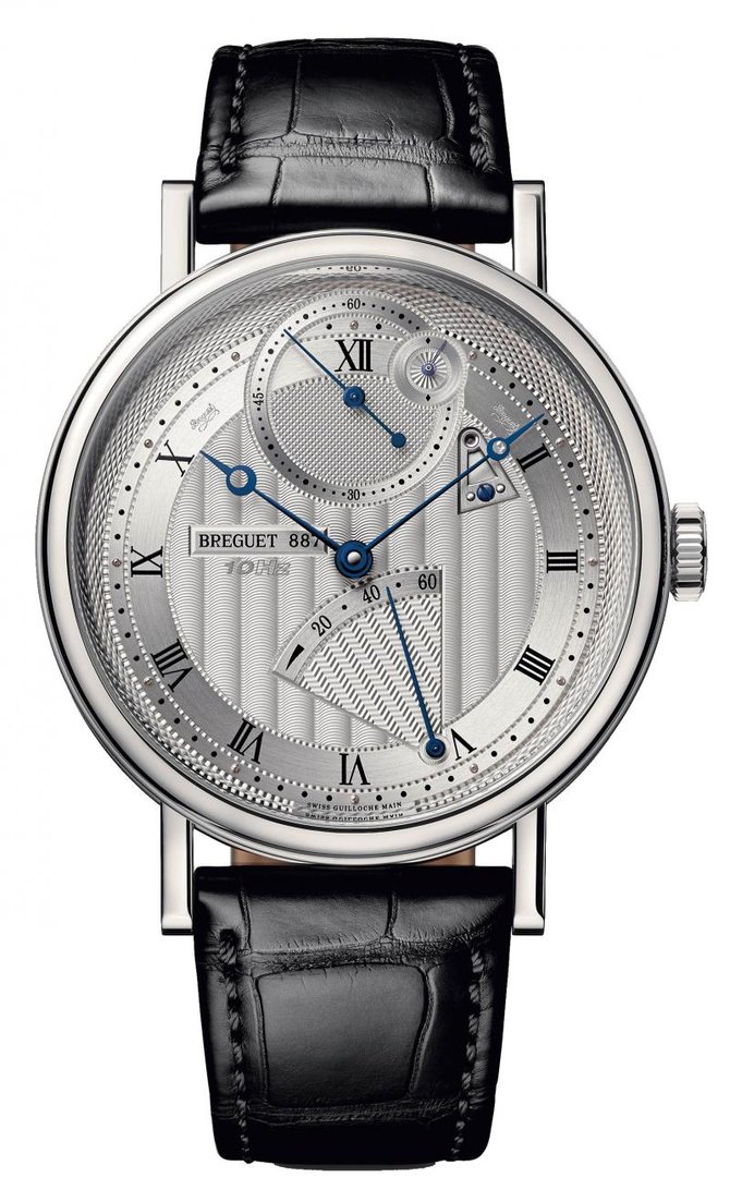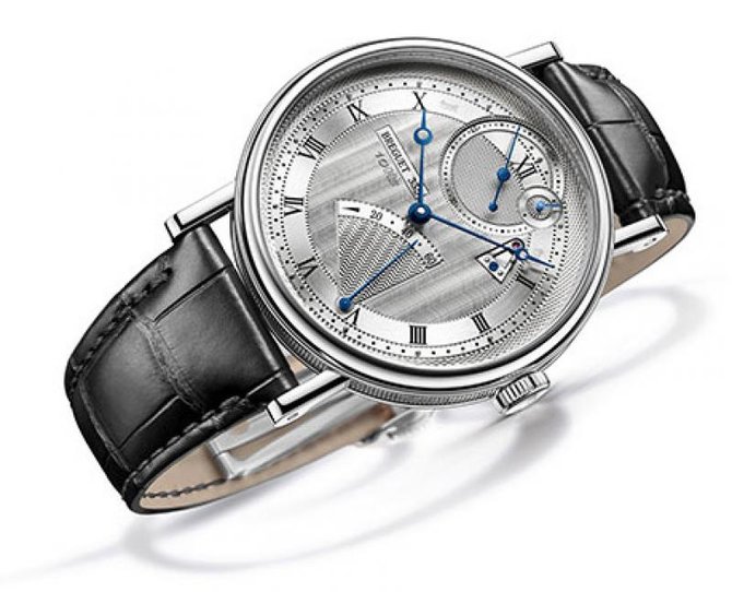 Модель от компании Breguet, Classique 7727 Chronometrie, обладает круглым полированным корпусом из белого золота с рифлеными вставками по бокам. Задняя крышка из сапфирового стекла, сквозь которое видно механизм часов с ручным заводом, Калибр 574 DR с балансовой частотой колебаний 10 Гц. Диаметр корпуса составляет 41 мм, а толщина - 9.65 мм. Рифленая заводная головка с нанесением выгравированного логотипа Breguet. Водонепроницаемость корпуса способна спасти механизм на глубине до 30 метров. Часовой циферблат гильоширован вручную. Модель обладает индивидуальной нумерацией с подписью Breguet. Часовая разметка на циферблате римская. Стрелки на циферблате - вороненые. Запас хода этой модели - 60 часов. Браслет из кожи крокодила черного цвета с золотой раскладной застежкой. В районе 5-ти часовой отметки - индикатор запаса хода. Прямолинейный швейцарский анкерный спуск изготовлен из кремния.