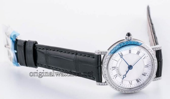 Вашему вниманию предлагается стильная модель женских наручных часов Classique Automatic Ladies от производителя Breguet. Круглый полированный корпус выполнен из 18-каратного белого золота в размерах: 30 мм в диаметре и 7.85 мм в толщине. Боковая сторона украшена неглубоким рифлением, что характерно для стиля Breguet. Не завинчивающаяся заводная головка декорирована синим сапфировым кабошоном. Циферблат сделан из натурального перламутра. На посеребренном циферблате великолепно смотрится орнамент гильоше который сделан вручную при помощи гильоширной машинки. Стрелки отлиты вручную из вороненной стали, и украшены "яблоками" в стиле Breguet. Механизм оснащен калибром 537/1 который работает на 20 камнях и имеет примерный запас хода на 40 часов. Прочное сапфировое стекло закрывает корпус с двух сторон. Благодаря задней прозрачной крышке сделанной из сапфира можно наблюдать за работой механизма. Водостойкость модели составляет 100 футов, что равняется 30 метрам. Ремешок сделан из кожи крокодила и оснащен золотой вставкой в 18 карат. Безель инкрустирован 48-ю белыми бриллиантами 0.98 ct.