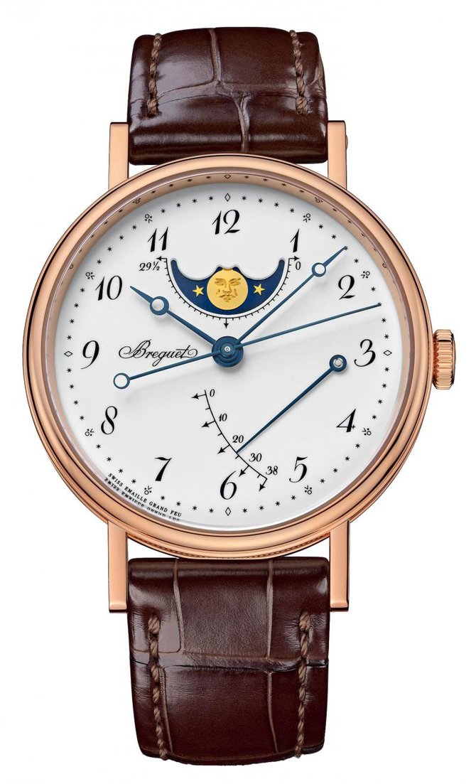 Очередная стильная модель женских наручных часов Classique Automatic Ladies 8787BR/29/986 от производителя Breguet. Круглый полированный корпус выполнен из 18-каратного розового золота и имеет 36 мм в диаметре. Боковая сторона украшена неглубоким рифлением, что характерно для стиля Breguet. Циферблат сделан цельной пластины розового золота. Стрелки отлиты вручную из вороненной стали, и украшены "яблоками" в стиле Breguet. Механизм оснащен калибром 537/1 который работает на 20 камнях и имеет примерный запас хода на 38 часов. Прочное сапфировое стекло закрывает корпус с двух сторон. Благодаря задней прозрачной крышке сделанной из сапфира можно наблюдать за работой механизма. Водостойкость модели составляет 100 футов, что равняется 30 метрам. Ремешок сделан из кожи крокодила и оснащен золотой вставкой в 18 карат.