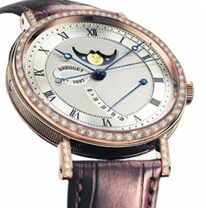 Знаменитый часовой бренд Breguet представил астрономические часы Classique Lady 8788 8788BR/12/986 DD00. Круглый полированный корпус модели выполнен из розового золота и инкрустирован бриллиантами. Водонепроницаемость корпуса - 30 метров. В комплекте с элегантной моделью идет не менее элегантный ремешок из высококачественной кожи аллигатора с раскладывающейся застежкой из розового золота. Посеребренный циферблат украшен ручной гравировкой "гильоше". Стрелки изготовлены из вороненой стали с, так называемыми, «яблоками Бреге». Размеры корпуса: диаметр - 36 мм, толщина - 10.5 мм. Механизм часов автоматический, Калибр 591 DRL. Около отметки "12 часов" расположился указатель фаз луны и лунного цикла; около отметки "3 часа" находится указатель запаса хода. Бока корпуса с рифленой обработкой. Главная особенность модели - кремниевый спуск, не нуждающийся в смазке.