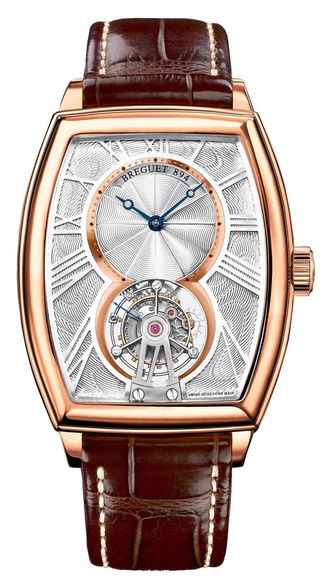 Очередная новинка в мире часов Heritage Collection 5497BR/12/9V6 от производителя Breguet. Корпус данной модели выполнен в форме бочки из 18-каратного розового золота , полирован, и имеет такие параметры: 42 мм в диаметре и 12.24 мм в толщине. Боковая сторона корпуса украшена неглубоким рифлением, что вполне характерно для стиля Breguet. Циферблат сделан из цельной пластины 18-каратного золота. Узор гильоше, нанесен вручную при помощи гильоширной машинки, и великолепно смотрится на посеребренном циферблате. Стрелки отлиты вручную из вороненной стали, и украшены характерными для стиля Breguet "яблоками". Ультратонкий механизм оснащен калибром 187H, и имеет запас хода приблизительно на 50 часов. Одна из главных особенностей часов, это турбийон. Водонепроницаемость модели составляет 100 футов, что равняется 30 метрам. Ремешок сделан из кожи аллигатора, и оснащен золотой застежкой в 18 карат.