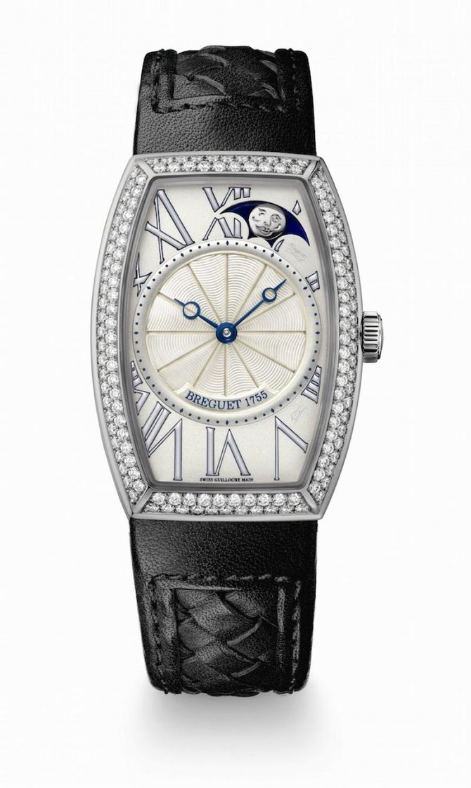 Вашему вниманию предлагается стильная модель женских наручных часов Heritage 8861BB/11/386 от производителя Breguet. Полированный корпус выполнен в форме бочки из 18-каратного белого золота и имеет такие параметры 35 х 25 x 9.75 мм. Боковая сторона украшена неглубоким рифлением, что характерно для стиля Breguet. Циферблат сделан из цельной пластины белого 18-каратного золота. Безель украшен белыми бриллиантами. На бежево-жемчужном циферблате великолепно смотрится орнамент гильоше который сделан вручную при помощи гильоширной машинки. Стрелки отлиты вручную из вороненной стали, и украшены "яблоками" в стиле Breguet. Механизм оснащен калибром 586L который работает на 20 камнях и имеет примерный запас хода на 40 часов. Прочное сапфировое стекло закрывает корпус с двух сторон. Благодаря задней прозрачной крышке сделанной из сапфира можно наблюдать за работой механизма. Водостойкость модели составляет 100 футов, что равняется 30 метрам. Ремешок сделан из кожи крокодила и оснащен золотой вставкой в 18 карат.