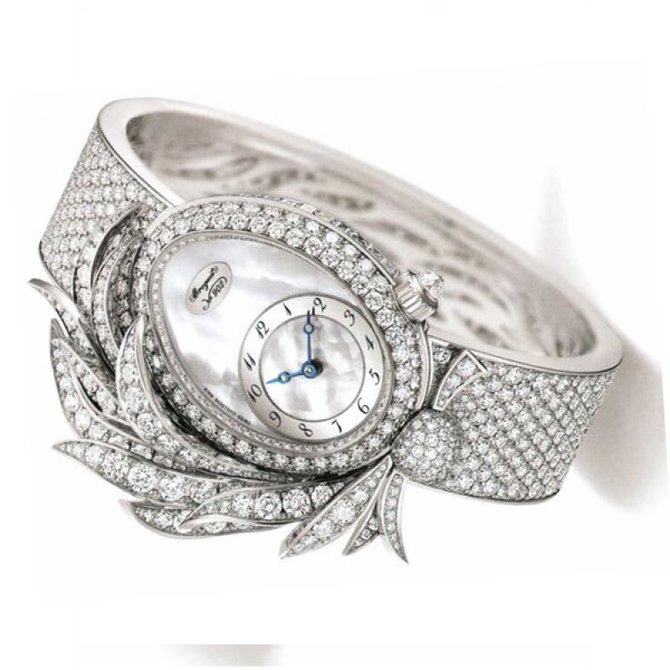 Очередная потрясающая модель женских наручных часов Breguet High Jewellery watches Reve de Plume ref. GJE15BB20.8924M01 от производителя Breguet не оставит к себе равнодушной ни одну женщину. Корпус этого ювелирного чуда сделан из 18-каратного белого золота, инкрустирован белыми бриллиантами, общий вес 940-а белых бриллиантов - 19.91 ct. Ультратонкий механизм оснащен калибром 586 и имеет запас хода на 38 часов. Ротор сделан из платины 950 пробы и украшен узором гильоше, который сделан вручную при помощи гильоширной машинки. Бело-жемчужный циферблат смещен на позицию 6 часов. Ремешок сделан из белого 18-каратного золота, инкрустирован белыми бриллиантами. Водонепроницаемость модели составляет 15 метров. Прочное, устойчивое к царапинам стекло сделанное из сапфира закрывает циферблат.