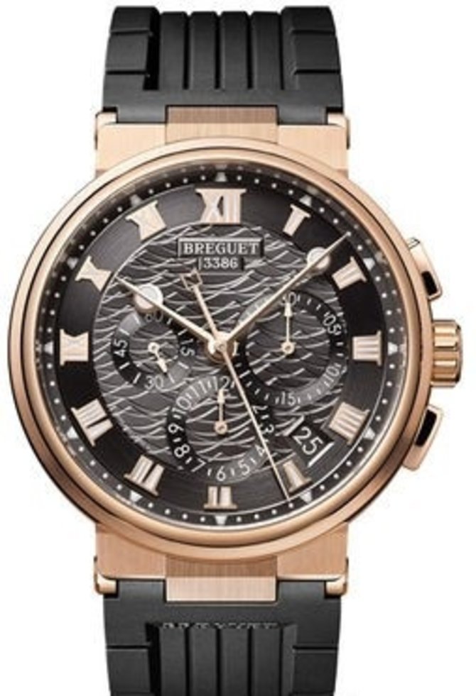 Мужские швейцарские часы от известной марки Breguet - Marine 5527 5527BR/G3/5WV представлены в оригинальном крупном корпусе из розового золота., размером 42.3 х 13.85 мм. На гильошированном циферблате, защищенном надежным сапфировым стеклом с противобликовым составом, показываются часы, минуты, секунды и дата, а также показания хронографа. На стрелки и часовые метки в виде римских цифр нанесено люминесцентное покрытие. Автоматический мануфактурный калибр 582QA обладает запасом хода на 48 часов и хронографом. Ремень из натурального каучука черного цвета дополнен классической пряжкой из золота. Водонепроницаемость корпуса рассчитана на 100 метров.