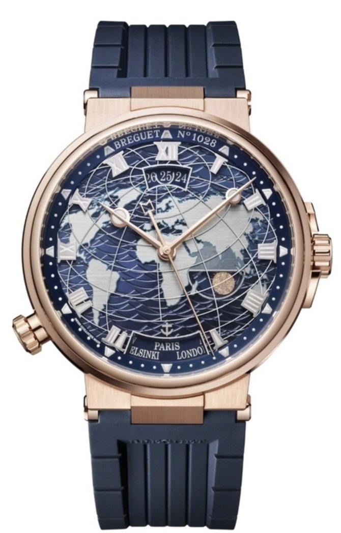 Знаменитая швейцарская часовая компания Breguet представила модель наручных часов Marine Hora Mundi 5557BR/YS/5WV на базе мануфактурного автоматического калибра Calibre 77F1 с таким функциональным набором: часы, минуты, секунды, дата, второе время, индикатор день ночь в виде Солнца и Луны. Многофункциональный циферблат защищен стеклом из сапфирового кристалла, который сверху покрыт противобликовым покрытием. Также из сапфирового кристалла выполнена прозрачная задняя крышка, которая открывает вид на работу установленного механизма. Корпус из розового 18-каратного золота отличается 50-метровой влагостойкостью. В комплекте с часами поставляется каучуковый ремень и фирменная золотая пряжка. Запас хода механизма рассчитан на 55 часов работы без подзавода. Данная модель выпущена в 2022 году.