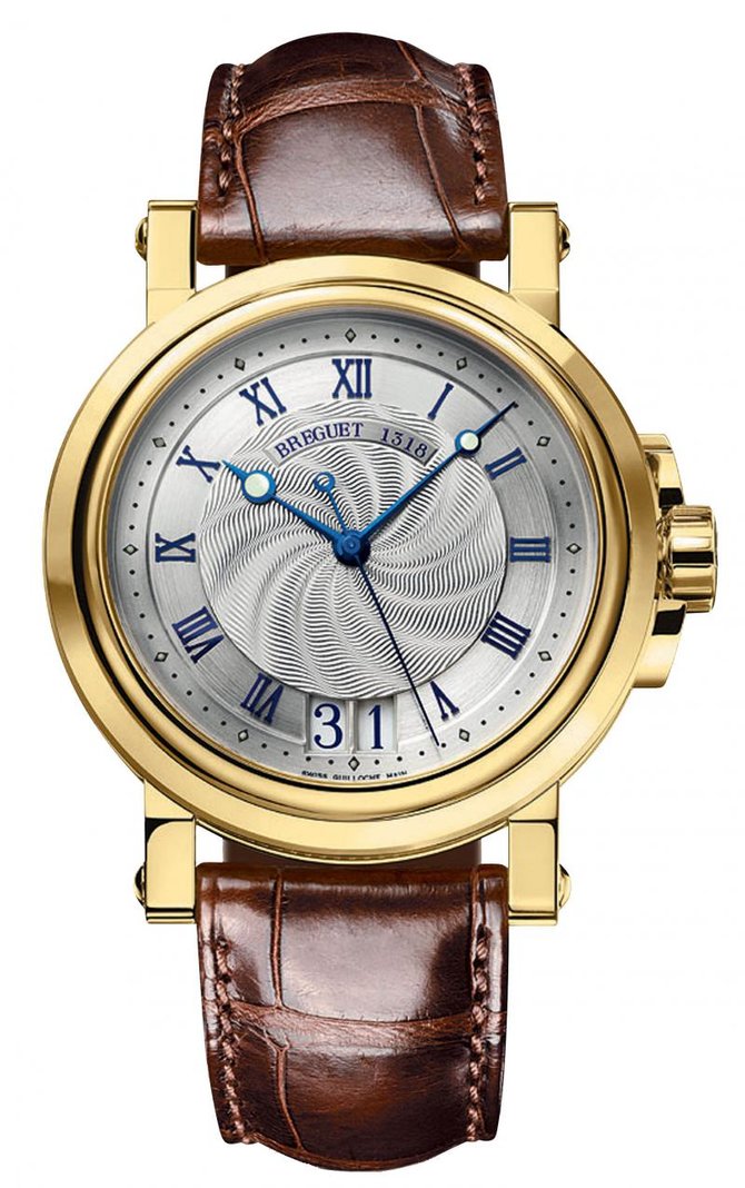 Часы Breguet Marine Automatic Big Date из 18-каратного желтого золота. Автоматический механизм, калибр 517GG. Циферблат из посеребренного 18-каратного золота с гильошированным вручную узором. Часовая шкала с римскими цифрами Breguet и люминесцентными минутными метками. Большой указатель даты в положении "6 часов". Люминесцентные граненые стрелки Breguet с наконечником в форме яблока из вороненой стали. Задняя крышка из сапфирового стекла с гильошированным вручную узором. Запас хода 65 часов. Водонепроницаемость 100 м.