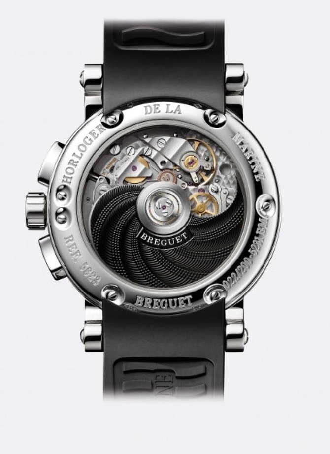 Новинка от бренда Breguet представлена в платиновом корпусе 950-ой пробы, диаметром 42 мм, который с двух сторон, лицевой и задней, защищен прочным сапфировым стеклом, крепче которого только алмаз. Герметичность платинового корпуса составляет 100 метров глубины, то есть 10 бар. На стрелки нанесено люминесцентное покрытие. Механизм модели автоматический, с хронографом, запас хода которого равен 2 суткам. Часы укомплектованы каучуковым браслетом с платиновой вставкой. Циферблат гильошированный. Часовые метки и стрелки из платины. Можно ничего не знать о часовом деле, но каждый, кто доучился хотя бы до старших классов средней школы, еще помнит, что поутру, когда Онегину совершенно нечего делать, он едет на бульвар «и там гуляет на просторе, пока недремлющий брегет не прозвонит ему обед». Большой знаток французского, Пушкин лучше других знал: «Breguet» должно читаться «Бреге», а не «Брегет». Но название этой марки уже в те времена столь глубоко укоренилось, что даже «солнцу русской поэзии» было не под силу пойти против традиции! Бреге - это работоспособность, изумительный вкус, острый ум, талант изобретателя, коммерческую жилку, удивительное знание человеческой натуры...
