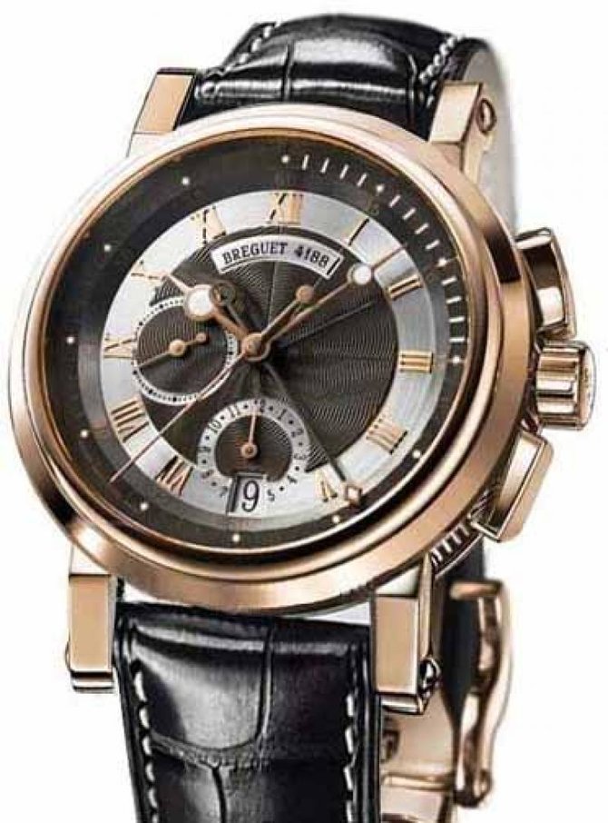 Линия Marine воплощает традиционные ценности часового дела, которые получили новую интерпретацию благодаря мастерам Breguet, создавшим более современные, более молодежные и удобные часы. Линия Marine, прямая наследница часов, разработанных А Л. Бреге для Королевского Флота, отвечает всем требованиям сегодняшнего дня. Благодаря солидной конструкции, прочному корпусу и защищенной заводной головке эти элегантные и одновременно спортивные часы, выполненные с исключительным изяществом, можно носить в любых обстоятельствах. Хронограф Marine из 18-каратного розового золота. Автоматический механизм. Циферблат из 18-каратного золота с черным родиевым покрытием и гильошированным вручную волнообразным узором. Часовая шкала с римскими цифрами, минутная шкала с арабскими цифрами, 15-минутный сектор и люминесцентные метки. Суммирующий счетчик минут и секунд хронографа в центре. 12-часовой счетчик и указатель даты в положении "6 часов". Малая секундная стрелка в положении "9 часов". Запас хода 48 часов. Задняя крышка из сапфирового стекла. Водонепроницаемость до 100 м. Кожаный ремешок с браслетной застежкой.