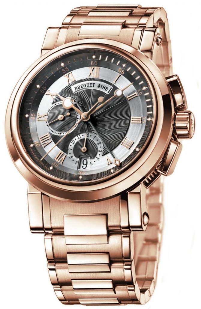 Мужские часы с хронографом представляет успешный бренд-производитель швейцарских наручных часов Breguet - модель Marine Chronograph - Mens в полированном корпусе из 18-ти каратного розового золота, диаметром 42 мм и толщиной 14.10 мм. Часы с автоматическим часовым механизмом. Гильошированный вручную посеребренный циферблат черно-серебристого цвета с золотыми римскими метками и увеличенной датой около 6-ти часовой отметки. Стрелки также золотые. Безель фиксируемый. Внушительный браслет также произведен из розового 18-ти каратного золота, золотая раскладная застежка. Лицевое стекло сапфировое, устойчивое к царапинам. Обратная сторона корпуса с прозрачной сапфировой задней крышкой, позволяющей наблюдать за работой автоматического механизма Caliber 583q/1 на 24 драгоценных камнях и 48-часовым запасом хода. Заводная головка рифленая с нанесением брендового логотипа Breguet. Водонепроницаемость модели составляет 100 метров.