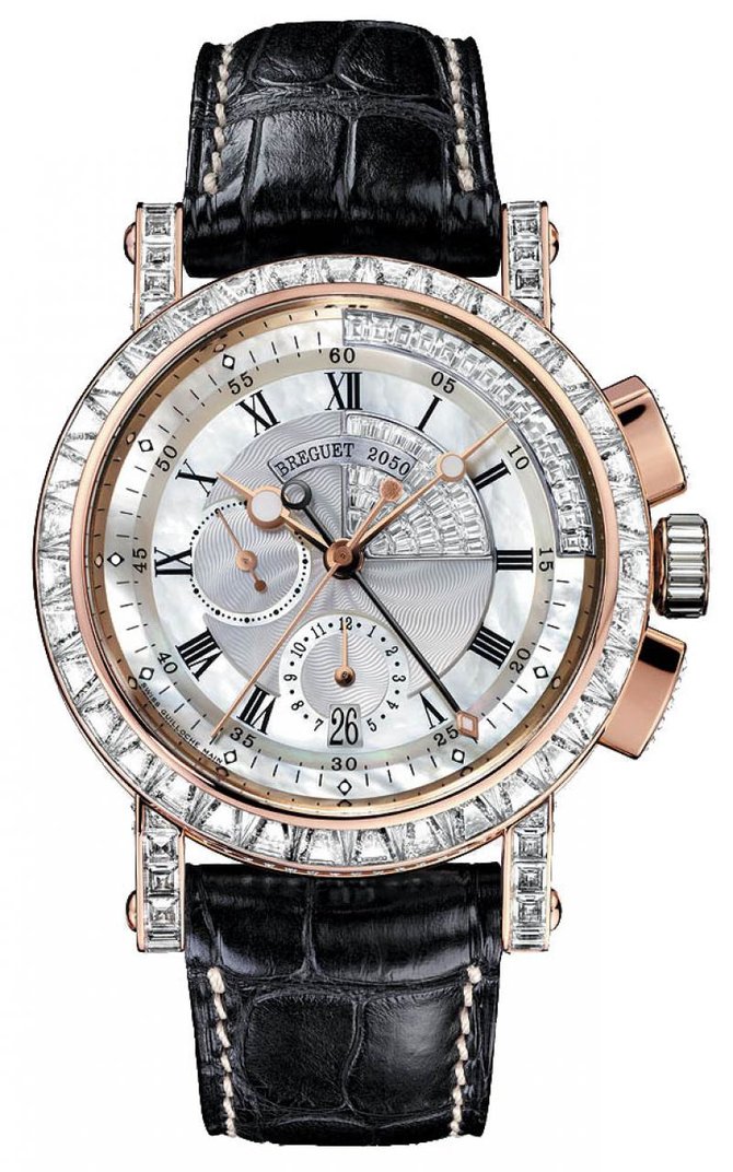 Очередная модель мужских часов Marine Collection 5829BR/8D/9ZU DD0D от производителя Breguet. Одно из главных достоинств этой модели это хронограф. Круглый корпус данной модели выполнен из 18-каратного розового золота , полирован, и имеет такие параметры: 42.2 мм в диаметре и 14.2 мм в толщине. Боковая сторона корпуса украшена неглубоким рифлением, что вполне характерно для стиля Breguet. Циферблат сделан из цельной пластины 18-каратного розового золота. Орнамент гильоше, нанесен вручную при помощи гильоширной машинки, и великолепно смотрится на посеребренном циферблате. Стрелки отлиты вручную из вороненной стали, и украшены характерными для стиля Breguet "яблоками". Также стрелки покрыты люминесцентной краской. Ультратонкий механизм оснащен калибром 583 Q/1, и имеет запас хода приблизительно на 48 часов. Водонепроницаемость модели составляет 100 метров. Ремешок сделан из желтого золота, и оснащен раскладывающейся застежкой в 18 карат. Корпус инкрустирован 186-ю белыми багетными бриллиантами 11.17 ct.