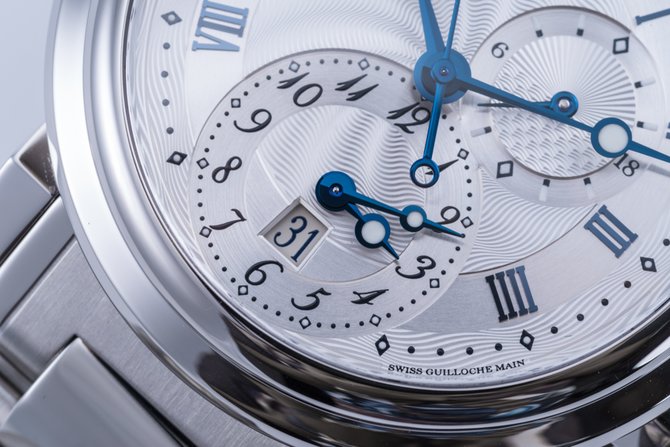 Мужские часы с функцией двойного времени представляет успешный бренд-производитель швейцарских наручных часов Breguet - модель Marine Automatic Dual Time в полированном корпусе из высококачественной нержавеющей стали с рифлеными боками, диаметром 42 мм и толщиной 12.25 мм. Часы с автоматическим часовым механизмом. Гильошированный вручную посеребренный циферблат серебристого цвета с воронеными римскими метками и датой около 6-ти часовой отметки. Стрелки также вороненые. Безель фиксируемый. Внушительный матовый браслет с полированными краями также произведен из нержавеющей стали со стальной раскладывающейся застежкой. Лицевое стекло сапфировое, устойчивое к царапинам, с антибликовым покрытием. Обратная сторона корпуса с прозрачной сапфировой задней крышкой, позволяющей наблюдать за работой автоматического механизма Caliber 583q/1 на 28 драгоценных камнях, 65-часовым запасом хода и балансовой частотой - 28 800 пк/час. Заводная головка рифленая с нанесением брендового логотипа Breguet. Водонепроницаемость модели составляет 100 метров.