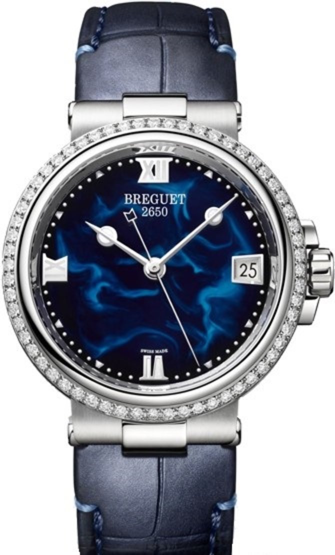 Швейцарские часы Marine 9518 9518ST/E2/984/D000 созданы компанией Breguet для элегантных женщин и помещены в коллекцию Marine. Полированный круглый корпус нержавеющей стали, выполненный в размере 33.8 х 9.89 мм, был украшен натуральными белыми бриллиантами классической огранки. Ремешок темно-синего цвета из кожи крокодила оснащен стальной пряжкой классического типа. На стрелки нанесен люминесцентный состав для индикации времени в темноте. Защищает превосходный перламутровый циферблат синего цвета стекло из сапфирового кристалла с противобликовым эффектом. Мануфактурный автоматический калибр 591A служит для индикации текущего времени. Герметичность корпуса 50 метров. Модель выпущена в 2019 году.