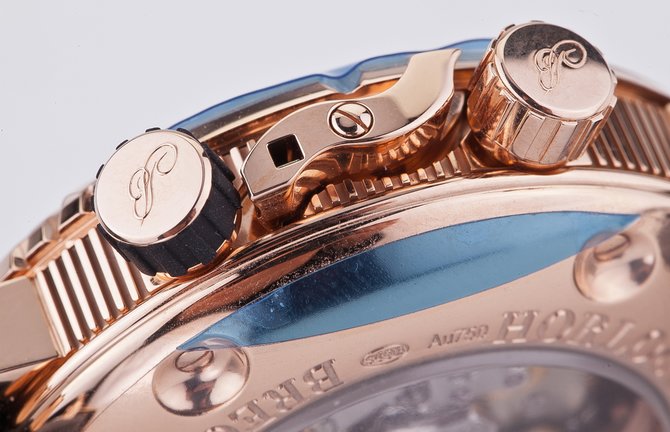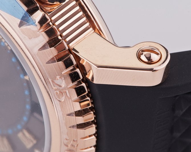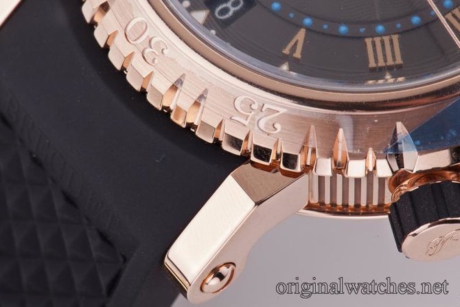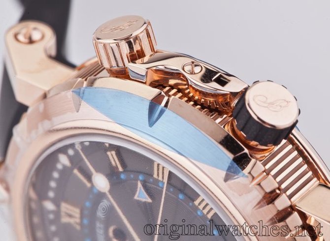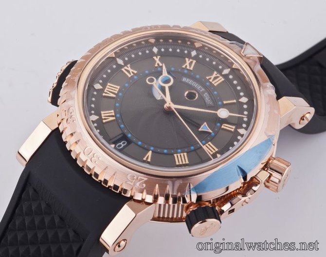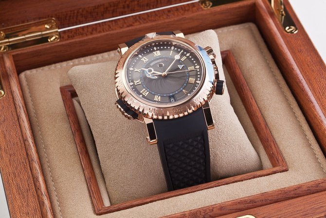 Действительно королевское пополнение «морской» коллекции от BREGUET. Хотя бы уже потому, что Marine Royale это первая модель в арсенале компании с такой внушительной водостойкостью. Конечно, можно сказать, что первейшим усложнением является турбийон, но функционально дайверская модель, оснащенная будильником, превосходит все имеющиеся в коллекции. Тем более звук под водой передается лучше, чем на воздухе. Корпус, диаметром 45 мм, выполнен из розового 18К золота, равно как и вращающийся в одну сторону безель. Циферблат - гравированный вручную. Завинчивающиеся заводные головки и кнопка из 18К розового золота, с каучуковым покрытием. Водостойкость 300 метров. Автоматический механизм Breguet caliber 519R, на 36 камнях, имеет запас хода 45 часов, частоту колебания баланса с винтовой регулировкой 4 Гц. Установка времени будильника производится коронкой на отметке «4 часа» и отмечается треугольной стрелкой на малом циферблате. Включение/выключение сигнала производится кнопкой на «8 часов» и отражается на круглом индикаторе в районе «12 часов». Индикатор запаса мощности будильника на отметке «10 часов».