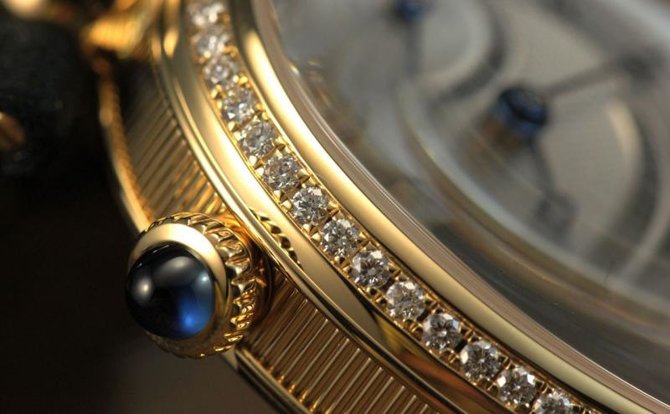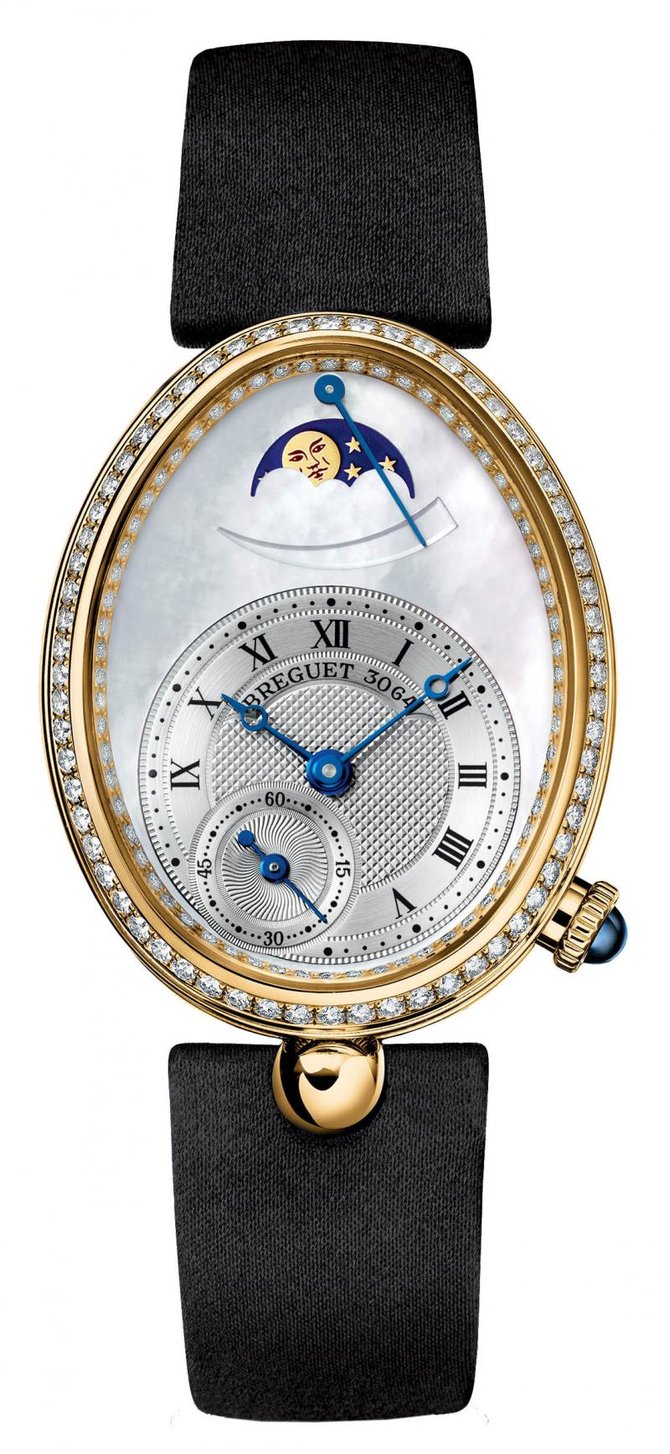 Золотые женские часы Бреге Reine de Naples созданы, чтобы угодить изысканному аристократическому вкусу. Корпус изготовлен только из благородных металлов – данная модель выполнена из желтого золота. Безель с отделкой 128 бриллиантами (около 0,83 карата). Драгоценные камни изящно повторяют линии овального корпуса, придавая ему завершенный вид. Циферблат из посеребренного золота с гильошированным вручную узором, часть циферблата выполнена из натурального белого перламутра, на нем самое важное – индикация часов и минут, малая секундная стрелка, индикатор запаса хода и индикатор фаз Луны в положении на 12 часов. Модель Reine de Naples оснащена автоматическим мануфактурным калибром Breguet Caliber 537 DRL1 с запасом хода порядка 40 часов с частотой 21600 пол/час, детали которого на 22 драгоценных камнях. В механизме используются инновационные технологии, позволяющие снизить силу трения и износ деталей: кремниевый рычаг спуска и балансовая пружина. Циферблат часов защищен прочным сапфировым стеклом. Водонепроницаемость корпуса до тридцати метров. Каждый корпус, циферблат и калибр несут на себе маркировку Бреге.
