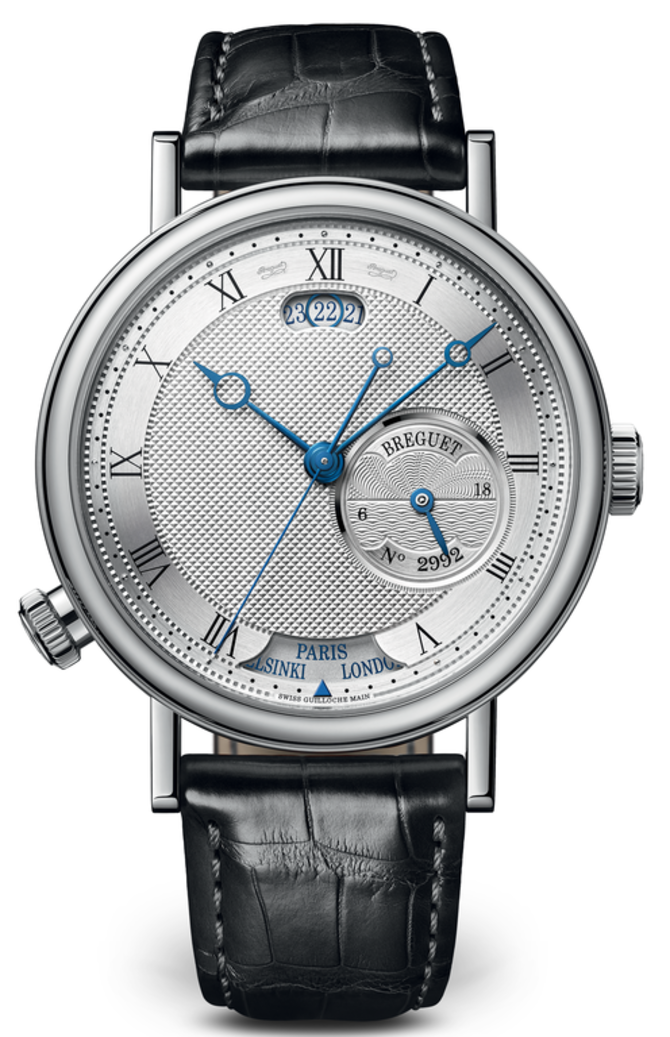 Потрясающая модель мужских наручных часов в круглом гильошированном корпусе из 18-каратного белого золота. Механизм 77F0 имеет запас хода на 55 часов. Циферблат накрыт выпуклым сапфировым стеклом. Корпус в диаметре 43 мм. Толщина - 12.6 мм. Серебристый циферблат гильоширован вручную. Вороненые стрелки синего цвета. Герметичность корпуса - 30 метров. Ремешок пошит вручную из кожи аллигатора. В комплекте - золотая раскладывающаяся застежка. На циферблате указываются часы, минуты, секунды, дата, мировое время, день/ночь. Цена, рекомендованная производителем - 68 400 EUR. Модель была официально представлена на часовой выставке Basel 2016.