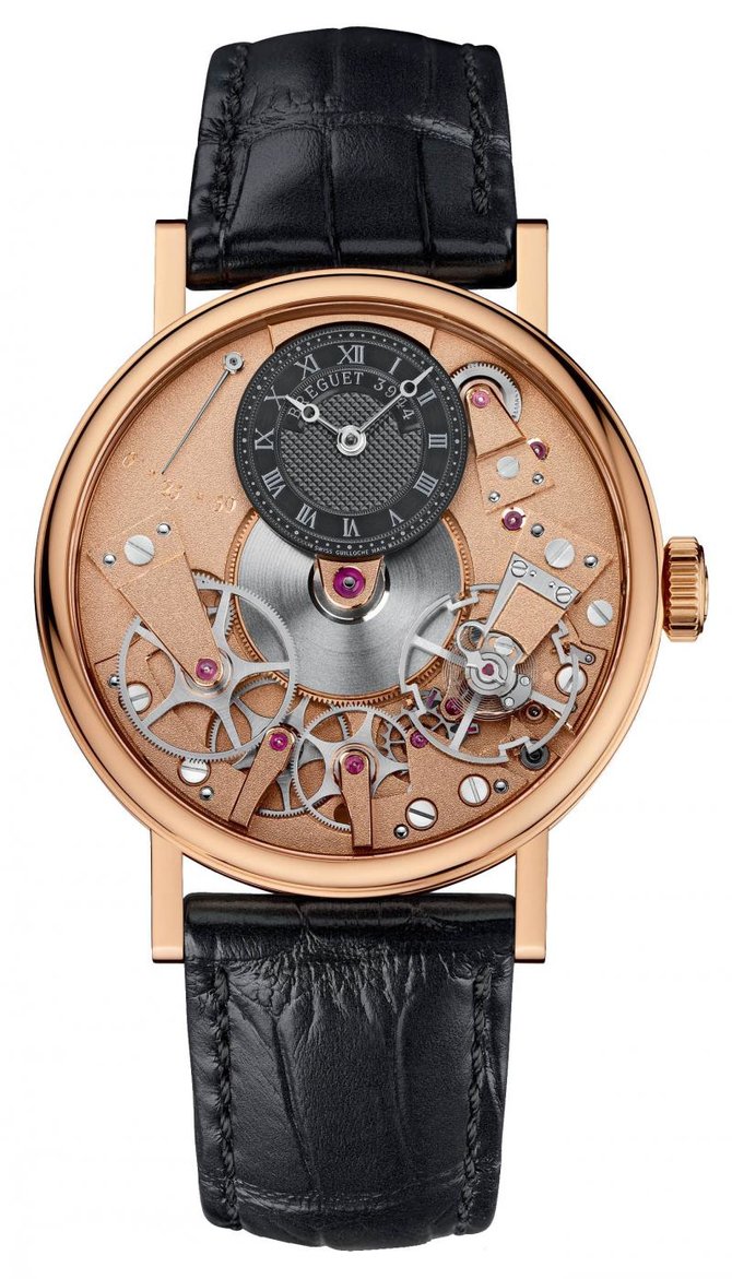 Очередная модель мужских наручных часов Tradition La Tradition Breguet 7027BR/R9/9V6 от производителя Breguet не оставит к себе никого равнодушным. Круглый полированный корпус выполнен из 18-каратного розового золота. Механизм оснащен калибром 507DR, который работает на 34 даргоценных камнях, и имеет приблизительный запас хода на 50 часов. Боковая сторона украшена неглубоким рифлением, что вполне характерно для стиля Breguet. Циферблат закрывает выпуклое сапфировое стекло. Корпус имеет такие параметры: 37 мм в диаметре, и 11.8 мм в толщине. Циферблат сделан из цельной пластины розового золота. На золотистом циферблате великолепно смотрится орнамент гильоше, который сделан вручную, при помощи гильоширной машинки. Стрелки отлиты вручную из вороненной стали, и украшены "яблоками" Breguet. Задняя крышка закрыта под давлением. Водонепроницаемость модели составляет 100 футов, что равняется 30 метрам. Черный ремешок сделан из кожи аллигатора, и оснащен золотой раскладывающейся застежкой в 18 карат.