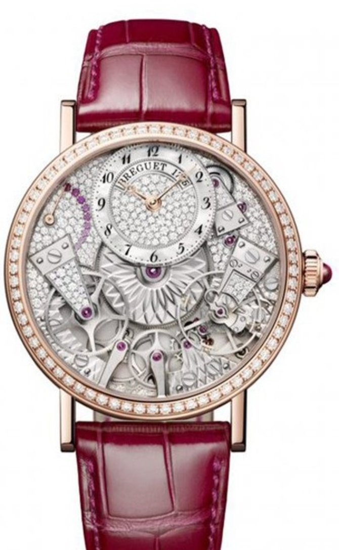 Женские ювелирные часы от Breguet - Tradition Lady 7035 7035BR/D8/9V6 D00D были выпущены в 2021 году. Бренд представил их в корпусе из розового золота, диаметром 37 мм. Внутри корпуса установлен автоматический калибр Breguet 505J с запасом хода на 50 часов, а также с индикатором запаса хода. На бриллиантовом циферблате показываются часы, минуты. Он защищен сапфировым стеклом с противобликовым свойством. В комплекте с часами поставляется ремень из кожи аллигатора и застежка из золота. Корпус герметичен до 30 метров. Модель выпущена в 2021 году ограниченной серией в 88 экземпляров.