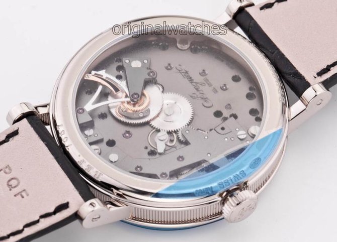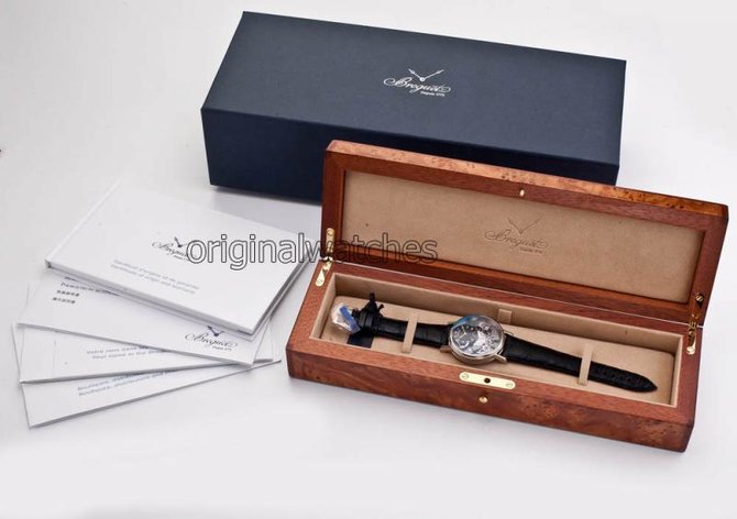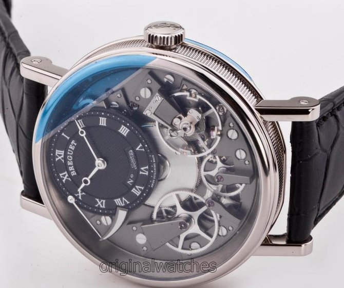 Breguet La Tradition это сочетание многолетних традиций и нового дизайна. Выпуск модели La Tradition 7057 – возвращение к истокам и дань традициям мануфактуры, передающимся из поколения в поколения: экземпляр стал культовым и занял достойное место в истории часового дела. При разработке дизайна мастера остановились на четырех вариантах, поэтому La Tradition 7057 выпущены в четырех версиях. Друг от друга они отличаются материалами, из которых сделан корпус, оформлением циферблатов и цветом ремешков. Так, одна из версий (Референс 7057BB/G9/9W6) имеет корпус из 18-каратного белого золота, черный гильошированный циферблат (склетонизированный) и поставляется на ремешке из кожи аллигатора со вставкой из белого золота. Еще одна версия (Референс 7057BB/11/9W6) выполнена в корпусе из белого золота, имеет серебристый гильошированный циферблат-скелетон, укомплектована ремешком из крокодиловой кожи со вставкой из белого золота. В корпусе из 18-каратного розового золота изготовлена третья и четвертая версии (Референс 7057BR/G9/9W6, 7057BR/R9/9W6), которые имеют черный скелетонизированный гильшоришрованный циферблат и ремешки из кожи аллигатора с золотой вставкой. Корпус La Tradition 7057 имеет круглую форму, на боковых поверхностях рифление, установлено сапфировое стекло. Диаметр корпуса составляет 40 мм, толщина – 11,65 мм, водонепроницаемость – 30 м. На циферблате каждой версии нанесен индивидуальный номер и надпись Breguet, стрелки стальные с фирменным знаком – «яблоками Бреге». La Tradition 7057 укомплектованы мануфактурным механизмом с ручным заводом (Калибр 507DR) с 50-часовым запасом хода, выполняющим функции индикации часов, минут, запаса хода. Калибр покрыт сплавом из металлов платиновой группы, имеющим цвет серого антрацита.