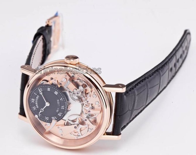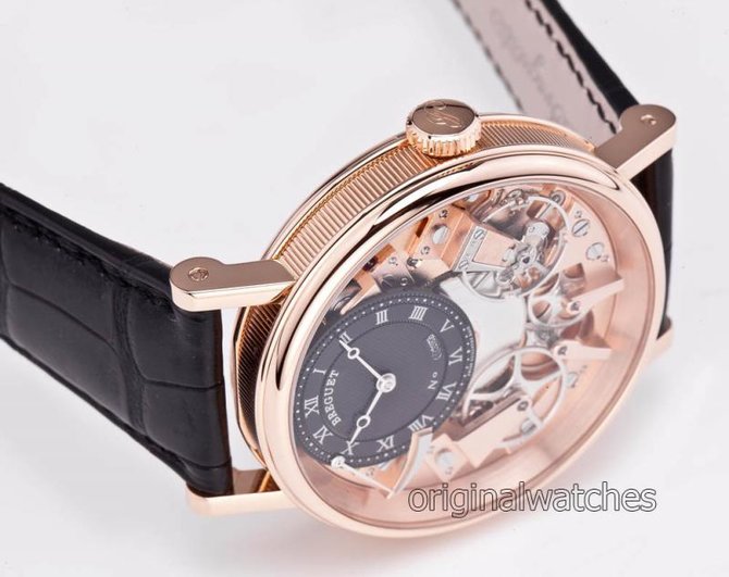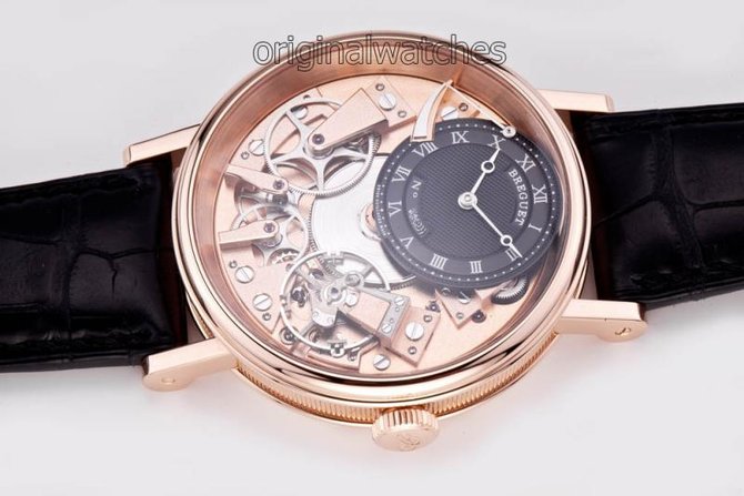 Новинка 2011 года. Знаковая коллекция компании Breguet, символизирующая не только традиции бренда, но и его стремление к инновациям, пополнилась новыми версиями модели La Tradition 7057. Премьера первой модели La Tradition состоялась в 2005 на выставке в Базеле. Ныне знаменитая мануфактура представила свое новое, удивительное детище. В текущем году компания представила сразу три новые версии модели: в корпусе из 18К розового золота с отделанным этим же металлом механизмом, а также корпусах из 18К белого или розового золота с механизмом с матовым пепельно-серым гальваническим покрытием NAC, состоящим из металлов платиновой группы). Под сапфировым стеклом размещен не стандартный циферблат, а уникальную композицию, состоящую из элементов механизма - мостов, шестерен, спуска и, конечно же, изобретенного Абрахамом-Луи Бреге в 1790 году «парашютом» («pare-chute»), изготовленным из стали. Индикация часов и минут осуществляется на смещенном к 12 часам гильошированном циферблате с римскими цифрами, стрелками с «яблоками Breguet» из стали, обработанной пескоструйным аппаратом, и выгравированным индивидуальным номером. Модель оснащена механизмом 507DR с ручным заводом, колесом баланса Breguet с четырьмя регулировочными винтами, .балансирной "пружиной Breguet", запасом хода 50 часов и функциями индикации часов, минут и индикатором запаса хода.