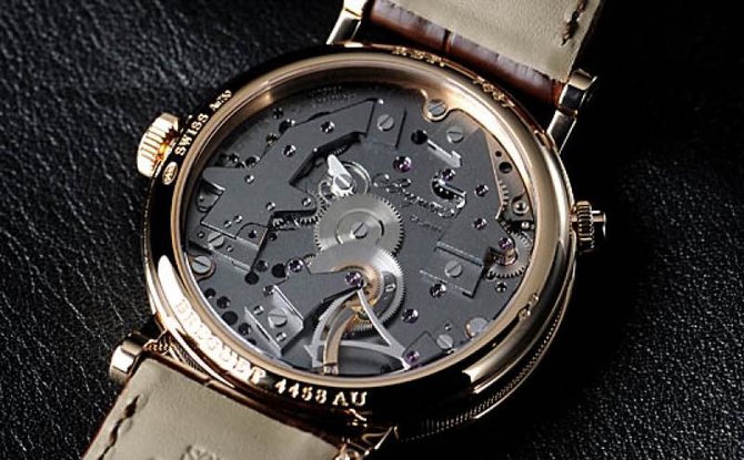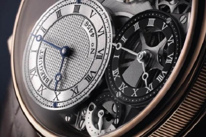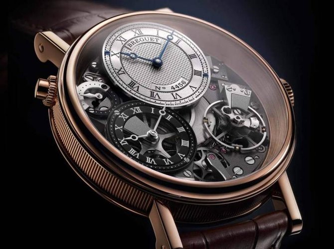 На выставке в Базеле 2012г. популярнейшая и старейшая швейцарская часовая мануфактура Breguet представила новинку из коллекции Tradition Breguet 7067 GMT. Первая модель этих наручных часов была выпущена в 2005 году. Работу механизма этих хронографов можно было наблюдать со стороны циферблата. Также появилась функция временных зон, которую оценили любители путешествий по всему миру. Это стильные и современные наручные часы, очень просты в эксплуатации. Временные зоны легко устанавливаются с помощью кнопки на корпусном кольце в положении «10 часов». Счетчик временных зон расположен на смещенном от центра циферблате в позиции «12 часов», а второй гильошированный циферблат - в позиции «8 часов» - показывает исходное время с помощью индикатора день-ночь в позиции «10 часов», его цвет меняется с серебристого на черный. Внешний облик наручных часов Tradition GMT совершенно соответствует стилю коллекции: механизм антрацитового цвета контрастирует с балансиром, находящимся в положении «4 часа». Стрелки Breguet выполнены из полированной стали с открытыми концами. Наручные часы Tradition GMT снабжены механизмом 507 DRF. 14½ линий на 40 камнях с ручным заводом и запасом хода в 50 часов. Индикатор запаса хода можно можно наблюдать с обратной стороны хронографа сквозь заднюю крышку сапфирового стекла. Через него также видна часть механизма. Диаметр корпуса составляет 40 мм. Корпус выполнен из розового золота 18К. Пружина Breguet с приподнятым конечным изгибом и инвертированный прямолинейный анкерный спуск изготовлены из кремния, это обеспечивает безупречную стабильность хода наручных часов Tradition GMT. Каждый экземпляр наручных часов имеет индивидуальный номер и подпись Breguet. Водонепроницаемость составляет 30 метров. Швейцарские наручные часы Breguet Tradition GMT дополнены кожаным ремешком. Они будут превосходно смотреться на запястье любого ценителя элегантности и роскоши.