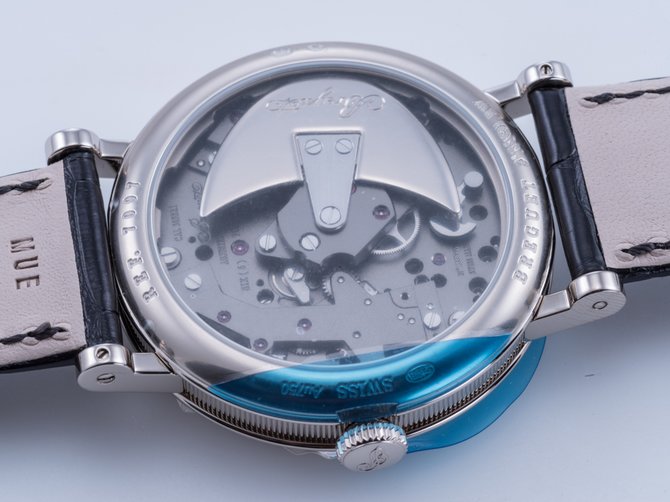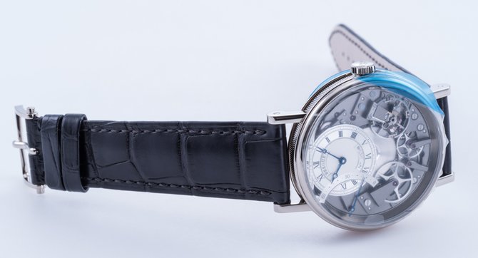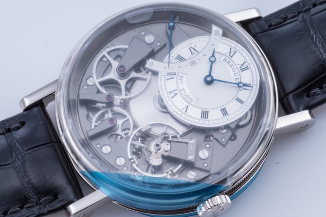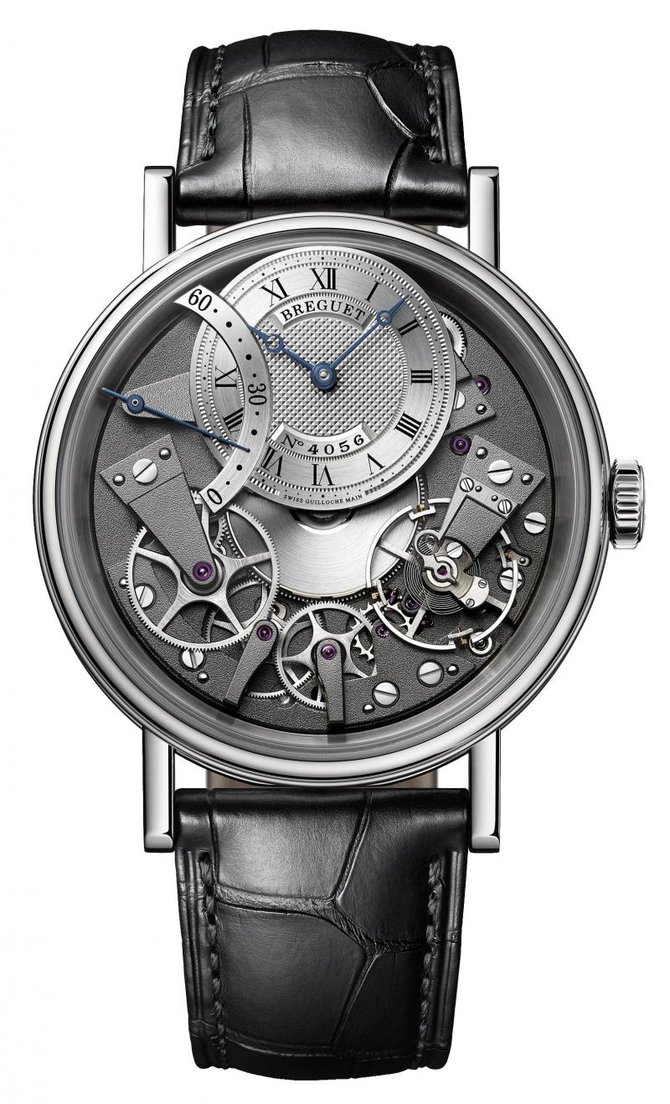 Компания-производитель швейцарских часов Breguet представила свою новую модель Tradition Automatique Seconde Rétrograde, которая вскоре появится на весомейшей международной часовой выставке под названием Baselworld-2015. Она пройдет с 19 по 26 марта 2015 года в городе Базель, Швейцария. Корпус новинки будет производиться в двух вариантах - из белого либо из розового золота; диаметр корпуса - 40 мм, водонепроницаемость - до 30 метров. Боковые части корпуса и заводная головка - рифленые вручную. Циферблат - скелетон, что позволяет видеть детали автоматического механизма на 38 камнях, с балансовой частотой 21600 п/к в час (3 гц), кремниевой балансовой пружиной и 50-часовым запасом хода. Индикация: часы, минуты, секунды. Комплектуется черным браслетом из крокодильей кожи с раскладывающейся застежкой, произведенной из золота.