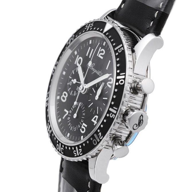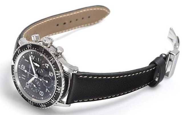 Очередная интересная модель мужских наручных часов из специальной серии 3803 Type XX Aeronavale Flyback Chronograph Limited Edition 3803ST/92/3W6 от производителя Breguet не оставит никого к себе равнодушным, потому как привлекает своим внешним видом и функциональностью. Круглый полированный корпус сделан из нержавеющей стали и имеет такие параметры: 39 мм в диаметре, 14.4 мм в толщине. Одни из главных особенностей данной модели конечно же хронограф, водостойкость и вращающийся безель. Боковая сторона корпуса украшена неглубоким рифлением, что характерно для стиля Breguet. Циферблат закрывает прочное стекло сделанное из сапфира. Стрелки отлиты вручную из вороненной стали. Ультратонкий механизм оснащен калибром Breguet 582 и имеет запас хода на 48 часов. Задняя крышка закрыта под давлением. Водонепроницаемость данной модели составляет 100 метров. Черный кожаный ремешок оснащен раскладывающейся застежкой. Часы были выпущены специальной ограниченной серией в 1000 экземпляров.