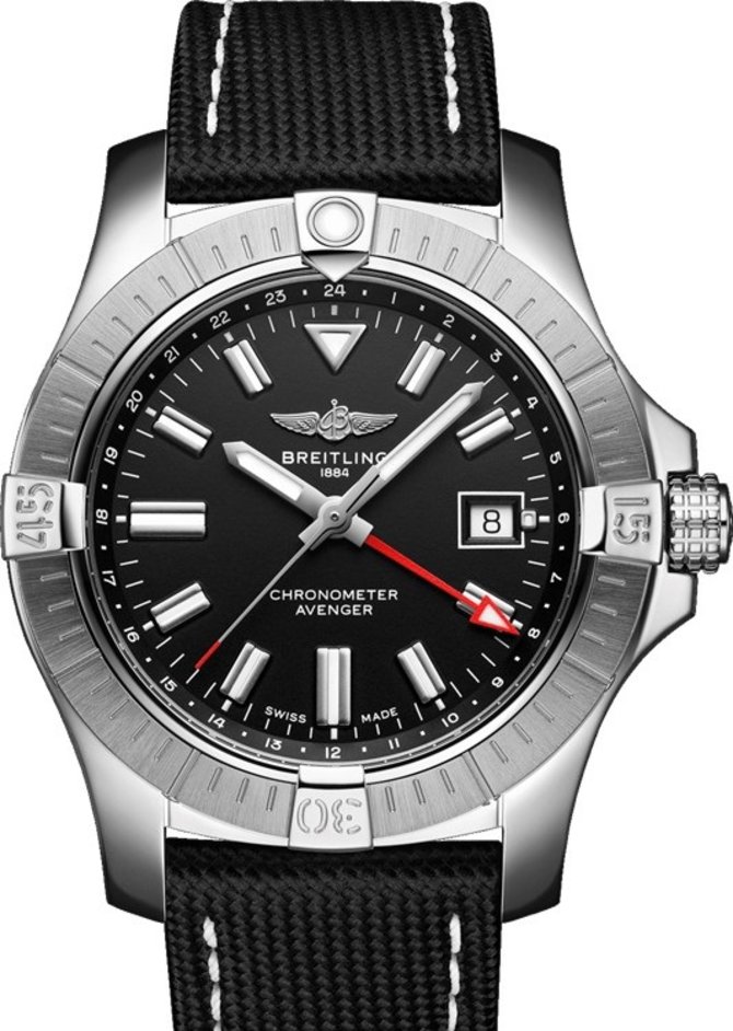 Мужскую модель дайверских швейцарских часов с функцией двойного времени Avenger Automatic GMT 43 A32397101B1X1 представил часовой бренд Breitling в 2020 году. Часы имеют круглый корпус из нержавеющей стали, размером 43 мм. Автоматический калибр Breitling 32 со статусом хронометра имеет 42 часа запаса хода. Циферблат накрыт стеклом из натурального сапфирового кристалла с противобликовыми свойствами. Стрелки для индикации времени выполнены из стали и покрыты люминесцентным составом, который светится в темноте. Безель вращается. Матерчатый ремень поставляется со вставкой из нержавеющей стали. Водонепроницаемость корпуса - 300 метров.