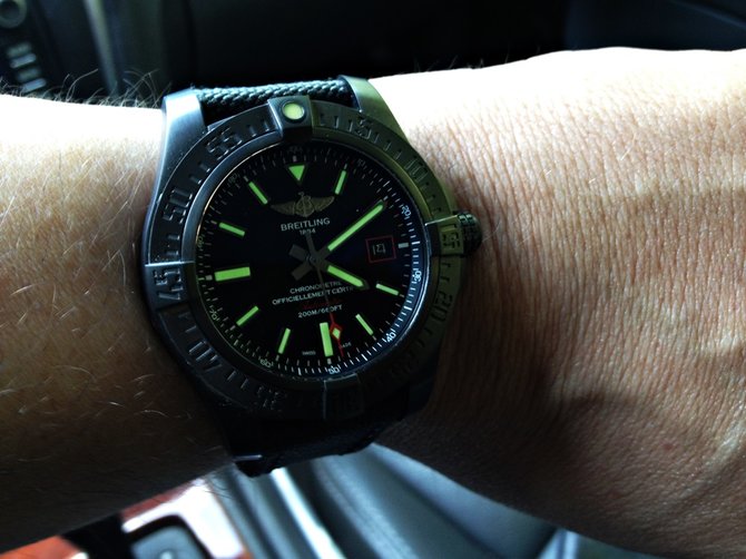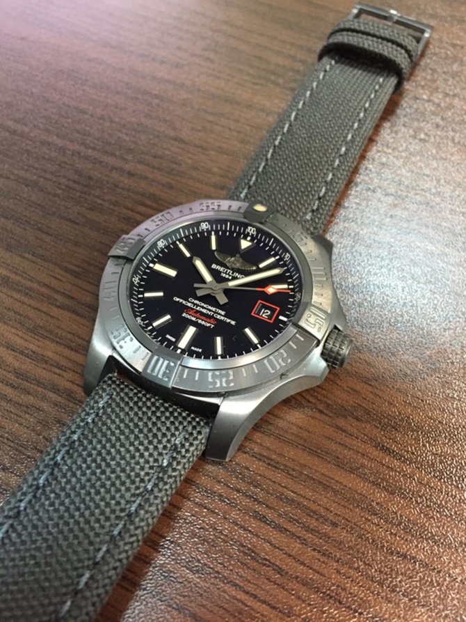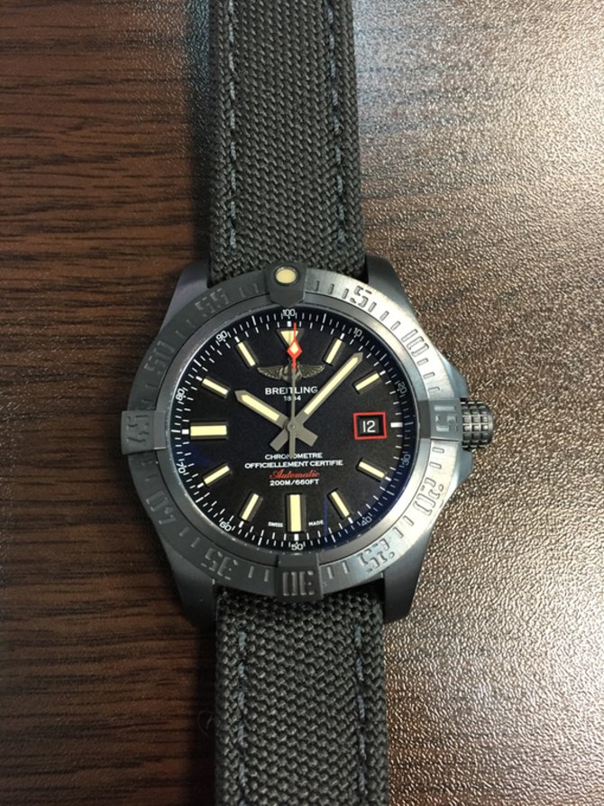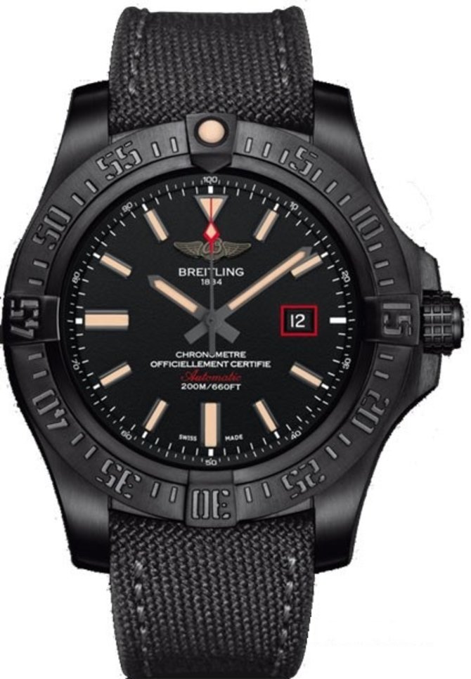 Корпус швейцарских часовBreitlingAvenger Blackbird 44 (Ref. V1731110/BD74/109W/M20BASA.1), произведенный из черного титана-карбида с dlc-покрытием, отличается 200-метровым уровнем герметичности. Размеры водостойкого корпуса: 44 мм в диаметре, 12.7 мм в толщину. Часы комплектуются черным нейлоновым ремешком, выполненным в стиле милитари, а также титановой застежкой с черным DLC-покрытием. Механизм, что установлен - мануфактурная разработка Breitling, отличающаяся автоподзаводом, запасом хода на 40 часов работы, а также индикацией даты и текущего времени. Частота баланса - 28 800 пк/час. На защите циферблата стоит выпуклое сапфировое стекло. Безель вращается в одном направлении.