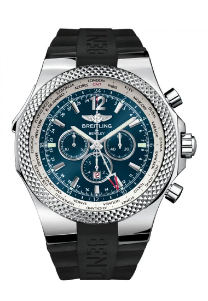 Bentley GMT – модель неординарная во всем, начиная со смелого дизайна. Чтобы не нарушить гармонии ее очертаний, ремешок подводится и крепится к корпусу ассиметрично, а хитроумная система отображения часовых поясов и уникальный механизм «30-секундного хронографа» делают ее еще оригинальнее. Благодаря корпусу необычной формы, это истинная скульптура малых форм на вашем запястье, отлитая в стали или драгоценных металлах и порой даже инкрустированная бриллиантами. Ободки счетчиков на превосходно отделанном циферблате, украшенном выпуклыми цифрами и часовыми метками, напоминают приборные панели автомобилей «бентли». Крупные нажимные кнопки подчеркивают стиль «хай-тек» и обеспечивают удобство регулировки. Прочный и эластичный ремешок из черного каучука – еще один штрих, делающий часы чрезвычайно современными. В модели Bentley GMT Midnight Carbon, которая вышла ограниченной серией в 1000 экземпляров, мы видим ту же неординарность, только в черном цвете: черный стальной корпус и удивительная ажурная отделка циферблата. Модель Bentley GMT British Racing Green (всего 1000 экземпляров) – это дань уважения великим традициям британского автомобилестроения. Его особенности – цвет внутреннего безеля и каучукового ремешка: тот знаменитый оттенок зеленого, что вошел в историю спорта как «британский гоночный» – боевая раскраска лучших гоночных авто Англии.