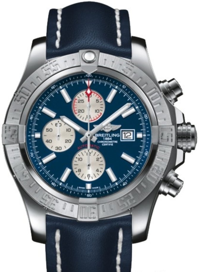 Дайверская модель Chronomat Super Avenger II A1337111/C871/101X/A20BA.1 мануфактурной разработки мастеров бренда Breitling представлена в стальном корпусе на механическом механизме Breitling 13. Модель комплектуется синим ремешком из натуральной кожи теленка и классической застежкой из стали. Калибр Breitling 13 с автоматическим подзаводом, запасом хода на 40 часов, а также возможностью индикации: часы, минуты, секунды, дата, показания хронографа. Диаметр корпуса из нержавеющей стали - 48 мм; толщина - 17.75 мм. Корпус с герметичностью до 300 метров. Стрелки и метки часов покрыты люминесцентным составом. Стекло из сапфира на лицевой стороне корпуса. Часы сертифицированы COSC как сверхточный хронометр.