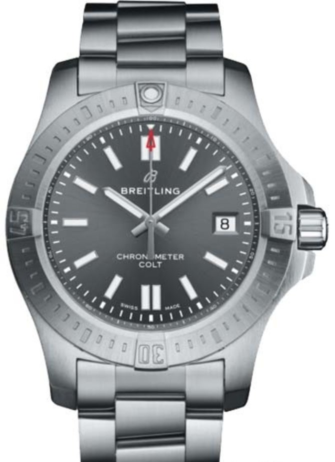 Breitling представили новую собственную разработку - модель Chronomat Colt Automatic 41 A17313101F1A1. Новинка швейцарских часов выпущена в круглом 41-миллиметровом стальном корпусе. Функционирует на базе механического мануфактурного калибра Breitling 17 с функциями автоподзавода и запаса хода, рассчитанного на 38 часов работы. На циферблате показываются часы, минуты, секунды, дата. Часы укомплектованы стальным браслетом с раскладной застежкой. Корпус имеет герметичность до 200 метров. Циферблат защищен сапфировым стеклом с антибликовым покрытием сверху. Для комфортного считывания данных при плохом освещении применено люминесцентное покрытие.