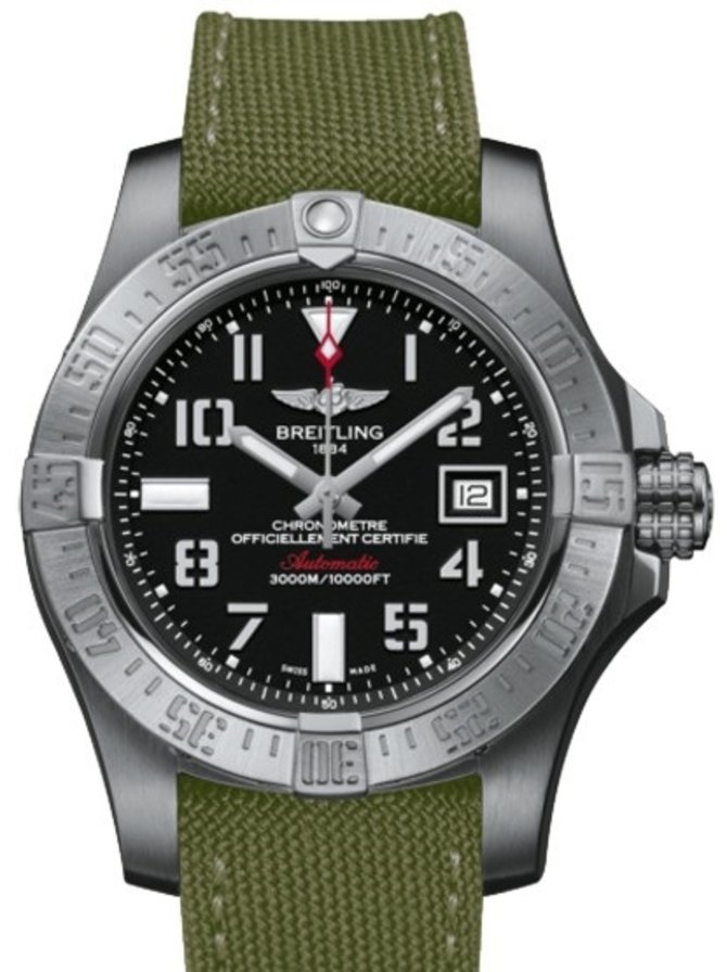 Breitling представил дайверские часы Chronomat Avenger II Seawolf A1733110/BC31/106W/A20BASA.1 с настоящей дайверской герметичностью - 3000 метров (300 бар, атм). Корпус произведен из нержавеющей стали, диаметром 45 мм. На безеле, который вращается в двух направлениях, находится гравировка в виде минутной шкалы. На черном циферблате размещены стальные метки и стрелки с покрытием люминесцентным составом. Индикатор даты расположен около отметки "3 часа". Циферблат накрыт выпуклым вперед стеклом из сапфирового кристалла с пртивобликовым составом сверху. На руке часы фиксируются ремешком из нейлона. Калибр Breitling 17 работает от автоподзавода, имеет 40-часовой запас хода и сертификат хронометра COSC.