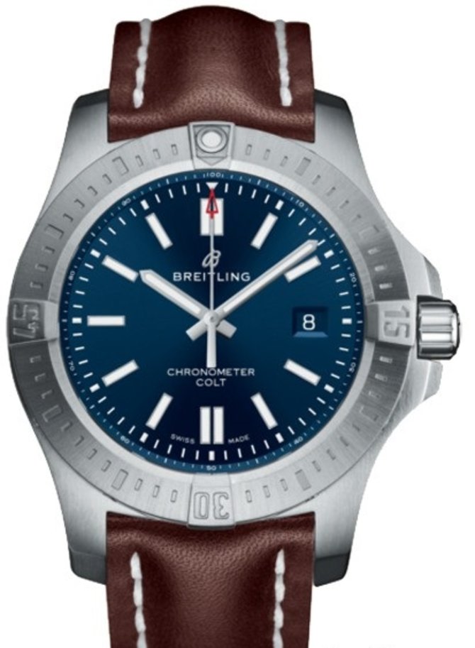 Мануфактура Breitling, основанная в Швейцарии в 1884 году, представила модель класса люкс Chronomat Colt Automatic 44 A17388101C1X2 в корпусе круглой формы, размером 44 мм х 11.25 мм, который был изготовлен из нержавеющей стали. Стальной часовой безель имеет гравировку - минутную разметку. Часы обладают высокой водонепроницаемостью, что рассчитана на 200 метров погружнеия под воду. Бренд Breitling самостоятельно разработал для модели Chronomat Colt Automatic механизм с автоматическим подзаводом Breitling 17, отмеченный престижным сертификатом хронометра COSC. Запас хода механизма - 38 часов. Основные функции часов - индикация текущего времени и даты. На стальные стрелки и метки из нержавеющей стали нанесено люминесцентное покрытие для видимости данных в темноте.