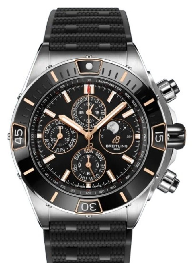 Спортивные наручные часы Chronomat Super Chronomat 44 Four Year Calendar I19320251B1S1 представлены знаменитым швейцарским брендом Breitling в комбинированном корпусе из нержавеющей стали, розового золота и керамики, диаметром 44 мм, что фиксируется на запястье ремнем из каучука черного цвета и застежкой из стали. Калибр Breitling 19 отличается функцией хронографа и индикацией таких данных: часы, минуты, секунды, дата, день недели, месяц, фаза луны, тахиметр. Работает от автоподзавода. Запас хода - 42 часа. Стрелки и метки часов из золота покрыты люминесцентным составом. Защитное стекло сделано из сапфирового кристалла с противобликовыми свойствами. Также особенностью данной модели есть наличие вращающегося безеля и 4-летнего календаря. Корпус отличается высокой водонепроницаемостью - до 100 метров. Год выпуска часов - 2021.